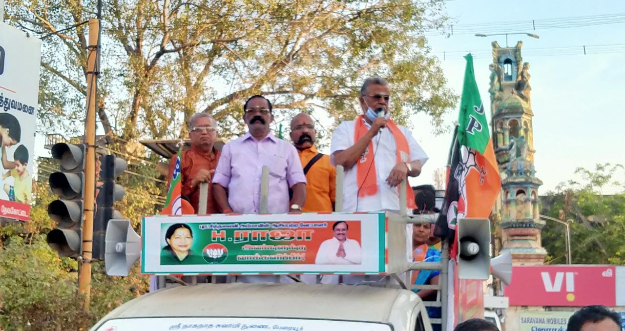 சிவகங்கை மாவட்டம் காரைக்குடி தொகுதியில் அதிமுக கூட்டணியுடன் போட்டியிடும் பாஜக வேட்பாளர் எச்.ராஜாவுக்கு தேவகோட்டை தியாகிகள் பூங்கா அருகில் பாஜக முன்னாள் எம்பி இல. கணேசன் வாகனத்தில் இருந்தவாறு பிரச்சாரம் மேற்கொண்டார்,
