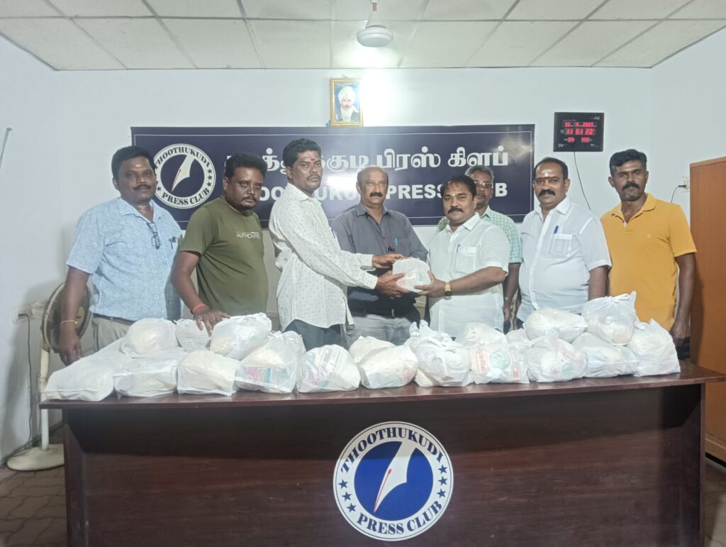 தூத்துக்குடி பிரஸ் கிளப் தலைவர் சண்முகசுந்தரம், செயலாளர் மோகன்ராஜ், பொருளாளர் ராஜு, துணைத் தலைவர் சிதம்பரம், இணைச் செயலாளர் சதீஷ்குமார், ஆகியோர் தலைமையில் கௌரவ ஆலோசகர்கள், அன்பழகன், அருண், ஆத்திமுத்து ஆகியோர் முன்னிலையில் உறுப்பினர்கள் அனைவருக்கும் பொருட்கள் வழங்கப்பட்டது. இந்த நிகழ்ச்சியில் செயற்குழு உறுப்பினர்கள் முத்துராமன் மாரி ராஜா, கண்ணன், லட்சுமணன், இருதயராஜ் மற்றும் உறுப்பினர்கள் ஜாய்சன், ராமச்சந்திரன், கற்பகநாதன், இசக்கி ராஜா, மாரிமுத்து, பாலகிருஷ்ணன், ரமேஷ், சேகர், சூர்யா, சந்தன ரமேஷ், முத்துக்குமார், அருள்ராஜ், நடராஜன், கார்த்திகேயன், ஜெயராமன், நீதி ராஜன், மாணிக்கம், செய்யது அலி சித்திக், உள்ளிட்ட உறுப்பினர்கள் பலர் கலந்து கொண்டு சிறப்பித்தனர்.