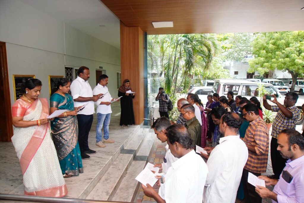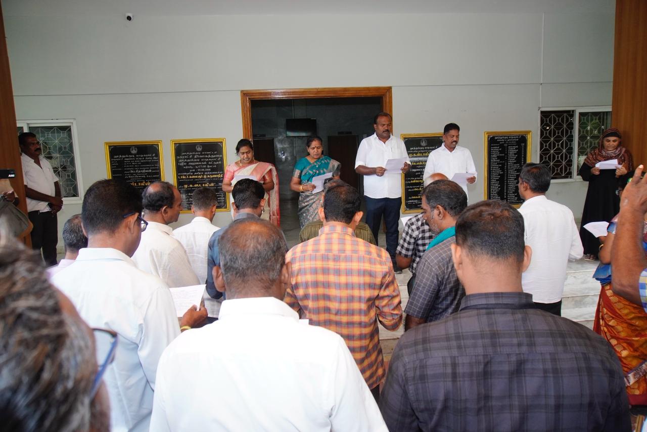 தமிழக அரசின் நடைமுறைகளை பின்பற்றும் வகையில் தூத்துக்குடி மாநகராட்சி அலுவலகத்தில் மேயர் ஜெகன் பெரியசாமி தலைமையில், உறுதி மொழி எடுத்துக் கொண்டனர்.