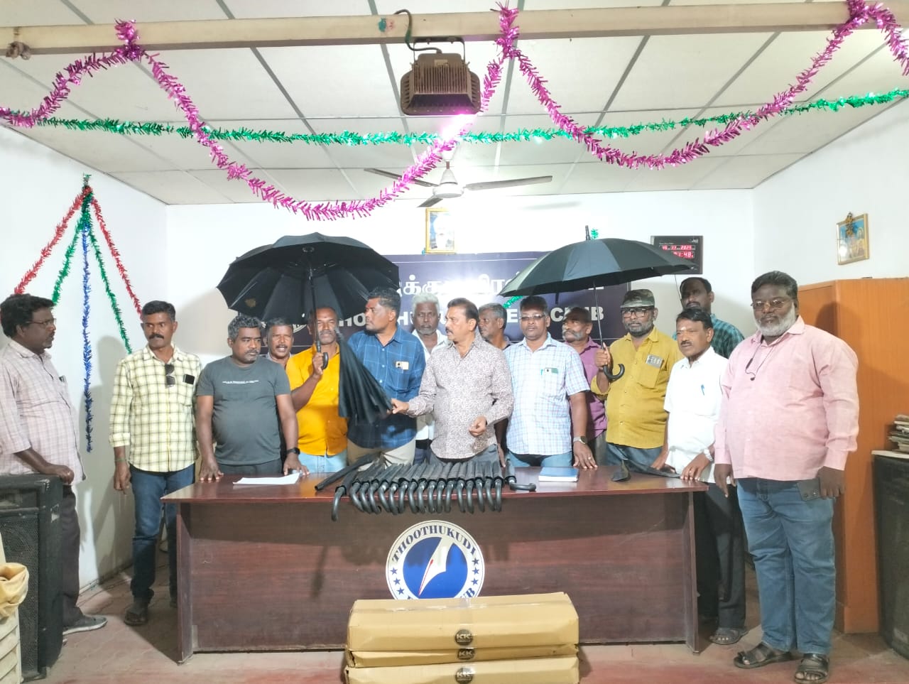 ஜனநாயகத்தின் நான்காவது தூணாக விளங்கும் பத்திரிகை துறையில் பணியாற்றும் செய்தியாளர்கள், புகைப்படகலைஞர்கள், ஒளிப்பதிவாளர்கள் ஆகியோர்களுக்கு தூத்துக்குடி பிரஸ்கிளப் சாா்பில் மழைகோட் வழங்க வேண்டும் என்று வடக்கு மாவட்ட திமுக செயலாளரும் சமூகநலன் மற்றும் மகளிா் உாிமைத்துறை அமைச்சர் கீதாஜீவனிடம் வேண்டுகோள் விடுத்ததன் அடிப்படையில் போல்பேட்டை முகாம் அலுவலகத்தில் அமைச்சர் கீதாஜீவன் மழை கோட் வழங்கினாா். அதை தொடர்ந்து இன்று தூத்துக்குடி பிரஸ்கிளப் சார்பில் பிரஸ்கிளப் உறுப்பினா்கள் அனைவருக்கும் குடை வழங்கப்பட்டது.