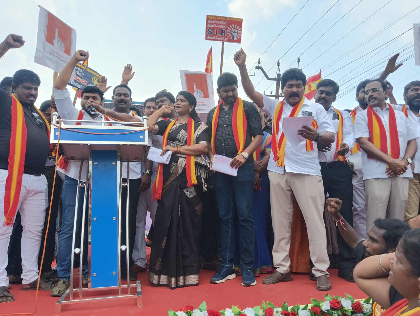 வாக்காளர் பட்டியல் சிறப்பு தீவிர திருத்தத்தைக் கண்டித்து தவெக சார்பில் மாநில துணைப் பொதுச் செயலாளர் சுபத்ரா ஜேகேஆர் முருகன், மாநில நிர்வாக குழு உறுப்பினர் பாலசுப்பிரமணியன் தலைமையில் எஸ். கிஷோர், எஸ் டி ஆர் சாமுவேல் ராஜ், வழக்கறிஞர் .பிரைட்டர், விஜி.சரவணன், முன்னாள் மாமன்ற உறுப்பினர்கள் எம். கோல்டன், ஜி ஆனந்தகுமார், எஸ்.அண்டோ ஆகியோர் முன்னிலையில் நடைபெற்றது.