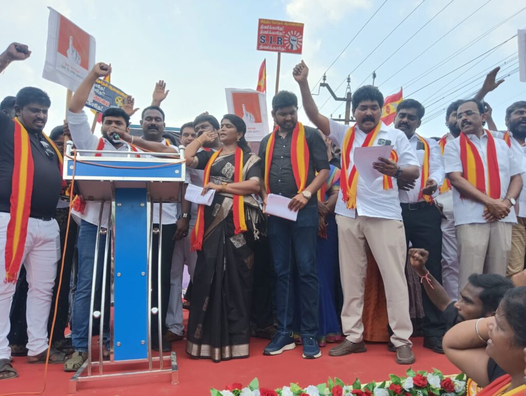 வாக்காளர் பட்டியல் சிறப்பு தீவிர திருத்தத்தைக் கண்டித்து, மாநிலம் முழுவதும் தமிழக வெற்றிக் கழகம் சார்பில் கண்டன ஆர்ப்பாட்டம் நடைபெற்றது.அதன்படி தூத்துக்குடி மாவட்டத்தில் தமிழக வெற்றி கழகம் சார்பில் விவிடி சிக்னல் அருகே அருகே மாபெரும் கண்டன ஆர்ப்பாட்டம் நடைபெற்றது. இதில் தவெக சார்பில் மாநில துணைப் பொதுச் செயலாளர் சுபத்ரா ஜேகேஆர் முருகன், மாநில நிர்வாக குழு உறுப்பினர் பாலசுப்பிரமணியன் எஸ். கிஷோர், எஸ்டிஆர் சாமுவேல் ராஜ், அஜிதா ஆக்னல் வழக்கறிஞர் .பிரைட்டர், விஜி.சரவணன், முன்னாள் மாமன்ற உறுப்பினர்கள் எம். கோல்டன், ஜி ஆனந்தகுமார், எஸ்.அண்டோ, தூத்துக்குடி மேற்கு மாவட்டம் அன்னை விஜி சரவணன்,உள்ளிட்ட முக்கிய நிர்வாகிகள் பங்கேற்றனர். மேலும் இந்த ஆர்ப்பாட்டத்தில் இளைஞர்கள் மகளிர்கள், உட்பட சுமார் இரண்டாயிரத்துக்கும் மேற்பட்டோர் பங்கேற்றுள்ளனர். இந்த நிகழ்ச்சியில் பங்கேற்ற மாநில நிர்வாக குழு உறுப்பினர் பாலசுப்பிரமணியன் பேசுகையில் 18 -23 வயதில் இருக்கக்கூடிய அனைவருக்கும் வாக்குரிமை கிடைக்க வேண்டும். எதிர்க்கட்சிகள் அனைவரும் இதில் ஒன்றிணைய வேண்டும்” என்று கேட்டுக்கொண்டார்.ஜனநாயகத்தின் ஆணிவேரை அசைத்து பார்க்கின்றனர். தமக்கு வாக்களிக்க மாட்டார்கள் என கருதுபவர்களின் வாக்கு அழிக்கப்படுகிறது. கள்ள ஓட்டு போடுபவர்களின் பெயர்கள் பல இடங்களில் சேர்க்கப்படுகிறது. சரியான முறையில் தேர்தல் நடத்தும் எண்ணம் ஆளும்கட்சிக்கு இல்லை. அவர்களுக்கு சாதகமாக அரசியல் சூழ்ச்சி நடைபெற்று வருகிறது.BLO-க்களை மிரட்டுவதை திமுக, பாஜக இரண்டும் கைவிட வேண்டும். அனைத்துக் கட்சிகளிடமும் கருத்து கேட்டு குளறுபடி இல்லாமல் SIR நடைபெற வேண்டும்” என்று கேட்டுக்கொண்டார்.அவரைத் தொடர்ந்து பேசிய முக்கிய நிர்வாகிகள் பலரும் பேசுகையில் திமுக மற்றும் பாஜக வாக்குச்சாவடி அலுவலர்களை கட்டுப்படுத்துவதை நிறுத்த வேண்டும் என்று வலியுறுத்தினர்.எஸ்ஐஆர் படிவங்களையாருக்கு தரவேண்டும் என்பதை திமுகவினர்தான் முடிவு செய்வதாக தவெக நிர்வாகிகள் குற்றஞ்சாட்டியுள்ளார். தூத்துக்குடி நடைபெற்ற இந்த ஆர்ப்பாட்டத்தில் தமிழக வெற்றி கழகத்தினர் திமுக பாஜகவை கடுமையாக சாடினார். சுமார் 2000-க்கும் மேற்பட்ட தவெக நிர்வாகிகள் தொண்டர்கள் தூத்துக்குடி மாவட்டத்தில் உள்ள பல்வேறு இடங்களில் இருந்து ஆர்ப்பாட்டத்தில் பங்கேற்க வந்ததால் தூத்துக்குடி மாநகரில் போக்குவரத்து ஸ்தம்பித்தது இதனால் தூத்துக்குடி மத்திய பாகம், தென் பாகம் போலீசார் சுமார் 70க்கு பேர்பட்டவர்கள் பாதுகாப்பு பணியில் ஈடுபட்டனர் தமிழக வெற்றி கழகத்தினர் இந்த ஆர்ப்பாட்டத்தின் போது பாஜக மற்றும் திமு