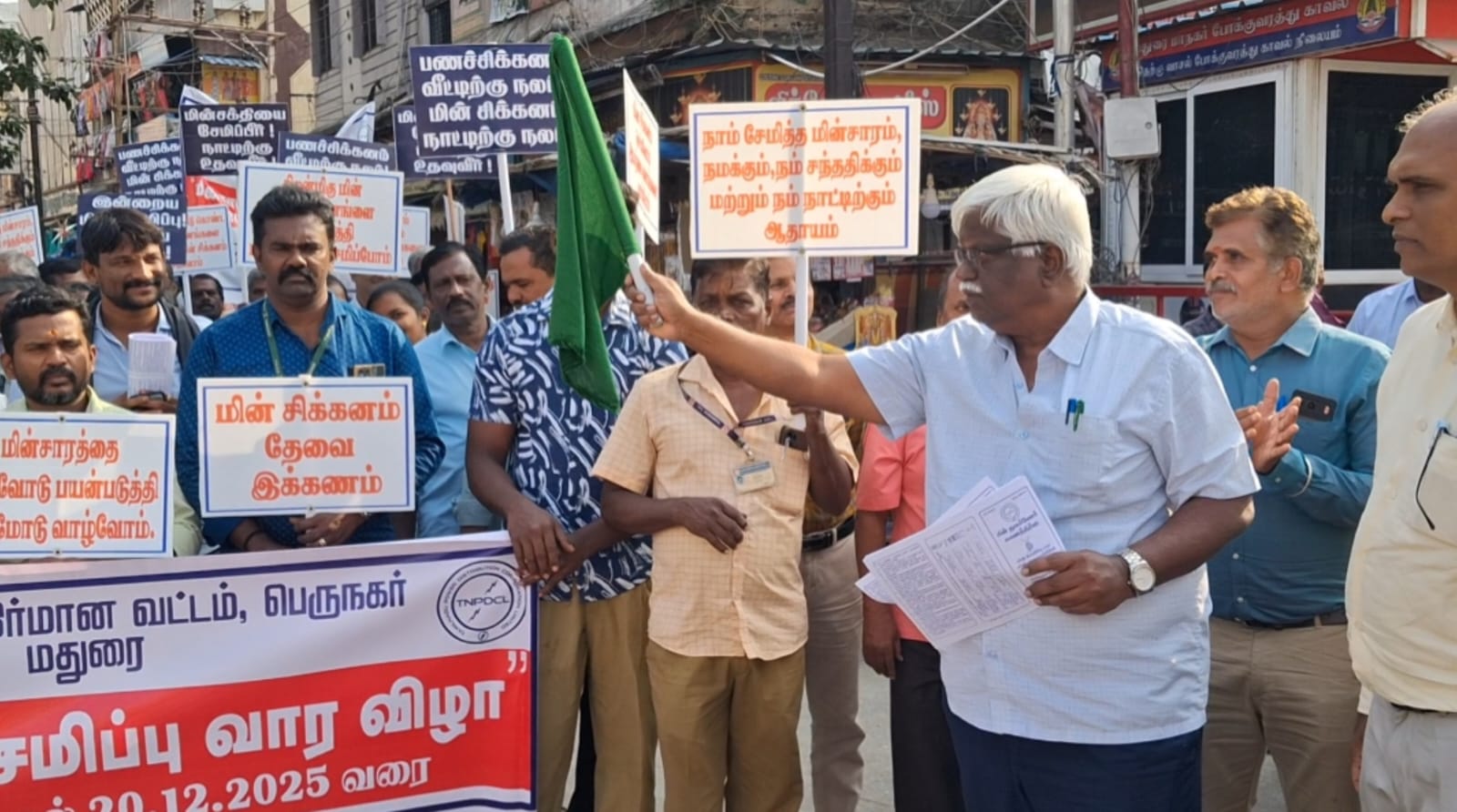 மதுரையில் மின்சார சேமிப்பு சிக்கன வாரத்தின் கடைசி நாளான இன்று (டிச.20) மாலை மக்களிடையே மின்சார சிக்கனம் குறித்து விழிப்புணர்வு ஏற்படுத்தும் விதமாக விளக்குத்தூண் பகுதியில் இருந்து தெற்கு மாசி வீதி வழியாக டி.எம். கோர்ட் வரை ஊர்வலமாக மின்சார வாரிய பணியாளர்கள் வந்தனர். ஊர்வலத்தை தலைமை பொறியாளர் பழனிச்சாமி தொடங்கி வைத்தார்.