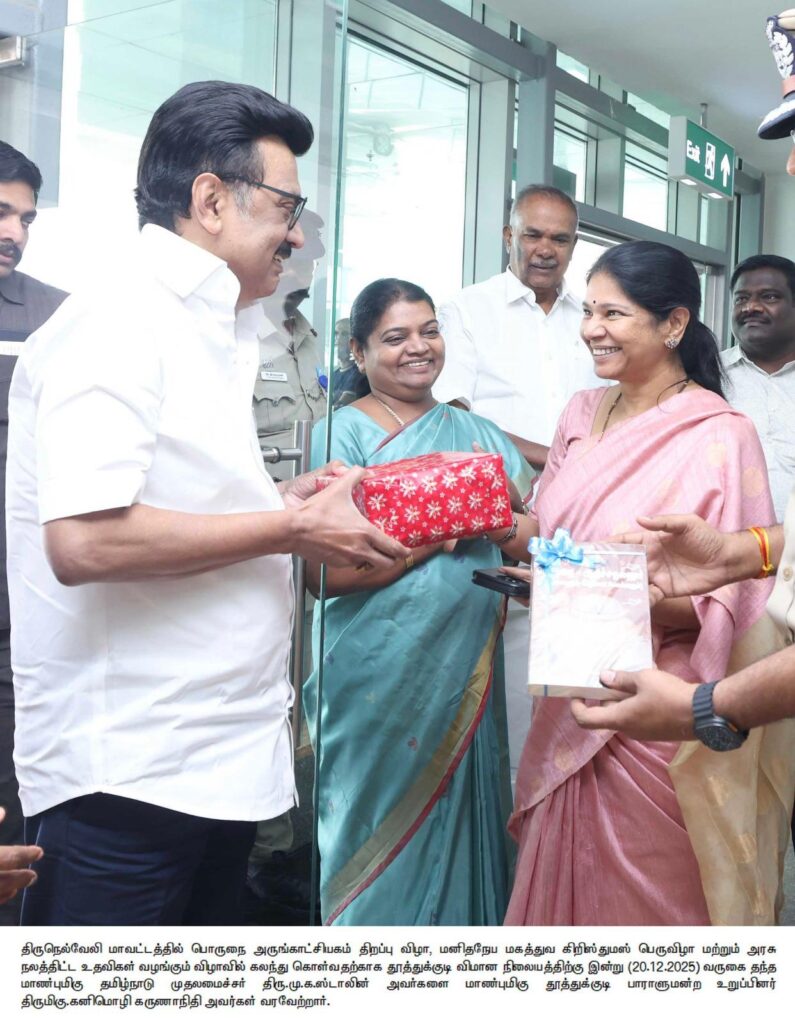 தூத்துக்குடி வாகைகுளம் விமான நிலையத்தில் முதல்வர் ஸ்டாலினுக்கு எம் பி கனிமொழி, அமைச்சர்கள் கீதாஜீவன், அனிதா ராதாகிருஷ்ணன், எம்எல்ஏக்கள் மேயர் உள்ளிட்ட முக்கிய பிரமுகர்கள் உற்சாக வரவேற்பு அளித்தனர்.
