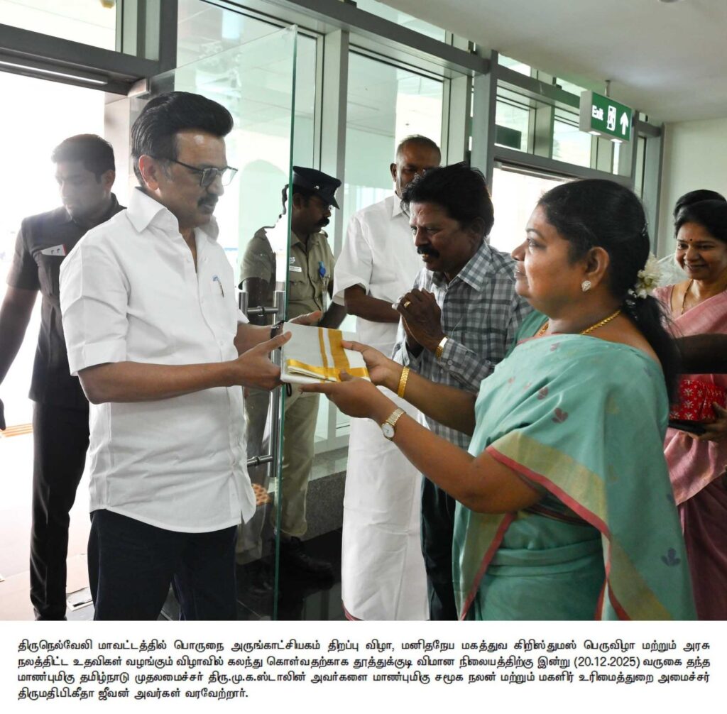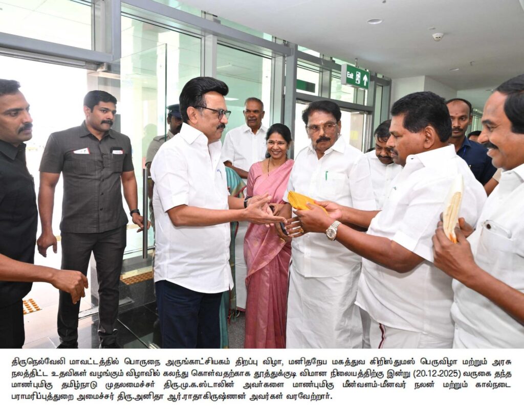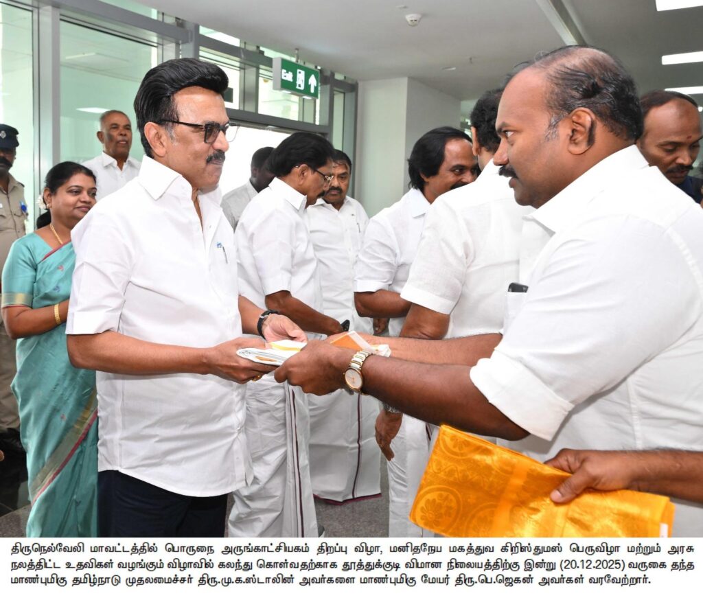 தமிழக முதலமைச்சர் மு.க.ஸ்டாலின் திருநெல்வேலி மாவட்டத்தில் நடைபெறும் பல்வேறு நிகழ்ச்சிகளில் கலந்து கொள்வதற்காக சென்னையிலிருந்து தனி விமானம் மூலம் வாகைக்குளம் வந்த அவருக்கு வடக்கு மாவட்ட திமுக செயலாளரும் சமூக நலன் மற்றும் மகளிர் உரிமைத் துறை அமைச்சர் கீதாஜீவன், தெற்கு மாவட்ட திமுக செயலாளரும், மீன்வளம் மீனவர் நலன் மற்றும் கால்நடை பராமரிப்புத்துறை அமைச்சர் அனிதா ராதாகிருஷ்ணன் ஆகியோர் தலைமையில் உற்சாக வரவேற்பு அளித்தனர். அதனை தொடர்ந்து, சபாநாயகர் அப்பாவு, தூத்துக்குடி எம்பி கனிமொழி, மாவட்ட ஆட்சித் தலைவர் இளம்பகவத் காவல் கண்காணிப்பாளர் அல்பர்ட்ஜான், ஆணையர் ப்ரியங்கா, அமைச்சர்கள் நேரு, ராமச்சந்திரன், மனோ தங்கராஜ், தங்கம் தென்னரசு, ராஜகண்ணப்பன், எம்.பி. வில்சன், எம்எல்ஏக்கள் மார்க்கண்டேயன், சண்முகையா, ரூபி மனோகரன், ராஜா, தமிழரசி, அப்துல் வஹாப், தூத்துக்குடி மேயர் ஜெகன்பெரியசாமி, திருநெல்வேலி மேயர் கிட்டு என்ற ராமகிருஷ்ணன், மாவட்ட செயலாளர் ஆவுடையப்பன், ஆகியோர் வரவேற்றனர்.