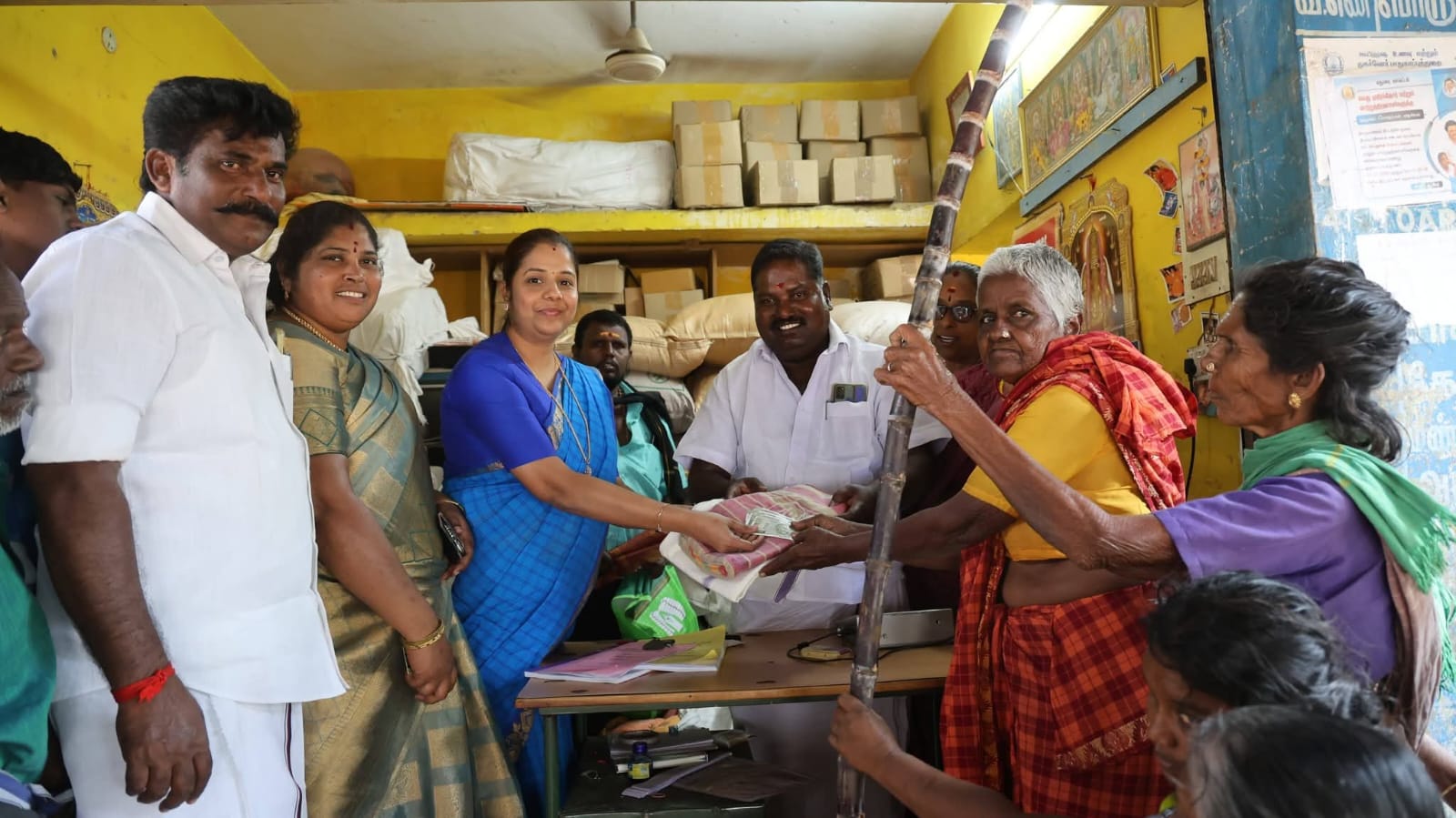 தமிழ்நாடு அரசு அறிவித்த பொங்கல் பரிசு தொகுப்பான 1கிலோ பச்சரிசி , 1கிலோ சீனி, ஒரு முழு கரும்பு, வேஷ்டி,சேலையுடன் ரூ.3000 ரொக்கம் ஆகியவற்றை தமிழகத்தில் உள்ள அனைத்து ரேஷன் கார்டுகளுக்கும் வழங்கி வரும் நிலையில் மதுரை அருகே நாகமலை புதூர் பகுதியில் உள்ள ரேஷன் கடையில் நேற்று (ஜன.8) தெற்கு மாவட்ட திமுக மகளிரணி அமைப்பாளர் கிருத்திகா தங்கபாண்டி அவர்கள் கலந்து கொண்டு பொதுமக்களுக்கு பொங்கல் வாழ்த்துகளை பரிசு தொகுப்பை கூறி வழங்கினார். உடன் திமுகவினர் மற்றும் பொதுமக்கள் பலர் இருந்தனர்.