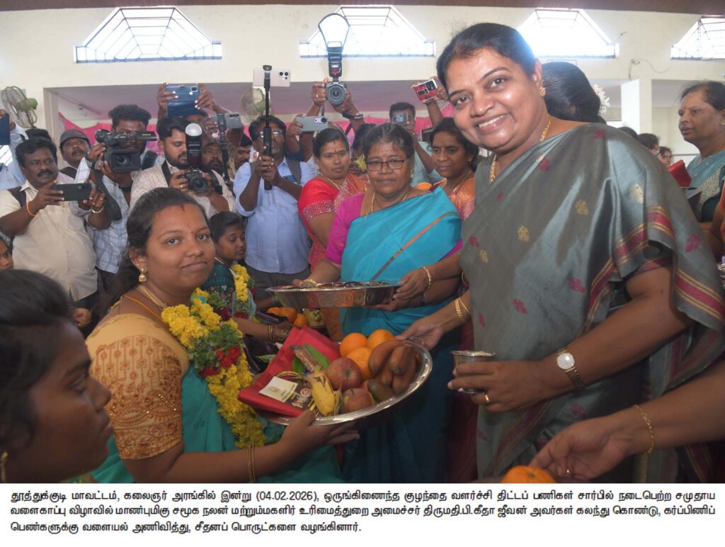 தமிழ்நாடு முதலமைச்சர் ஆணைக்கிணங்க இன்றையதினம் மாவட்டத்திற்குட்பட்ட தூத்துக்குடியில் 250 கர்ப்பிணி தாய்மார்களுக்கு நடத்தி வைக்கப்பட்டுள்ளது. சமுதாய வளைகாப்பு நிகழ்ச்சியில் கலந்து கொள்வதில் அனைவருக்கும் ஓரு மகிழ்ச்சி ஏற்படும் நானும் மட்டற்ற மகிழ்ச்சியடைகிறேன். கர்ப்பிணி தாய்மார்கள் கருவுற்ற நாளிலிருந்து மகிழ்ச்சியாக இருக்க வேண்டும் அந்த காலக்கட்டத்தில் குழந்தையும் வளர்ச்சியடையும் நேரத்தில் இதுபோன்ற வளையல் அணியும் போது அதன் ஓசைகளும் அதே போல் கொலுசு ஓசைகளும் கேட்கும் போது குழந்தை மகிழ்ச்சியாக இருக்கும் என்று நம்முடைய முன்னோா்கள் கூறியுள்ளனா். இந்த காலக்கட்டத்தில் உயரிய நோக்கில் அவர்களுக்கென பல்வேறு நலத்திட்ட உதவிகள் தமிழ்நாடு அரசால் வழங்கப்பட்டு வருகிறது. அதனடிப்படையில் தமிழ்நாட்டிற்குட்பட்ட அனைத்து மாவட்டங்களிலும் சமுதாய வளைகாப்பு நிகழ்ச்சி நடைபெற்று வருகிறது. தாய்மை என்பது புனிதமானது மற்றும் அற்புதமானது. குழந்தையை பெற்று வளர்ப்பதில் முழுமையான பொறுப்பு பெண்களிடம் தான் உள்ளது. நீங்கள் நங்கூரமாக இருந்து பாதுகாத்து கொள்ள கடமைப்பட்டவா்கள் அதை நம்மால் தவிர்க்க முடியாது. பெண்களால் தான் ஒரு சிறந்த சமுதாயத்தை உருவாக்க முடியும். நல்லதொரு பிள்ளையை பெண்களால் தான் உருவாக்க முடியும் என்பதை வளைகாப்பு நிகழ்ச்சிக்கு வருகை தந்துள்ள நீங்கள் அனைவரும் மனதில் வைத்துக் கொள்ள வேண்டும். பத்து மாதம் கஷ்டப்பட்டு குழந்தையை பெற்றெடுக்கிறீர்கள். இந்த காலகட்டங்களில் உங்களுக்கு சில உணவு வகைகள் பிடிக்காமல் போகும். ஆனால் கர்ப்பக் காலங்களில் சாப்பிடமால் இருக்க கூடாது. ஊட்டச்சத்து மிக்க உணவு வகைகளை சாப்பிட வேண்டும். அவ்வாறு சாப்பிட்டால் தான் வயிற்றில் வளரும் குழந்தையும் நல்ல ஊட்டச்சத்தோடு பிறக்கும். அந்த காலக்கட்டத்தில் உங்களது எடை 10 கிலோ அதிகாித்தால் தான் குறைந்தது 3 முதல் 3½ கிலோ எடையுள்ள குழந்தையை பெற்றெடுத்து அக்குழந்தைகளை முழுமையான உடல் தகுதியுடன் நன்றாக வளர்க்க முடியும். குறிப்பாக கர்ப்பக்காலங்களில் முட்டை, பால், பழங்கள், பாசிப்பயிறு, தட்டைப்பயிறு உள்ளிட்ட தானிய வகைகள் மற்றும் சத்தான உணவு வகைகளை நாம் சாப்பிடும் போது நாமும் ஆரோக்கியமாக இருப்போம் பிறக்கும் குழந்தையும் ஆரோக்கியமாக இருக்கும். மேலும் பேறுகாலத்தின் போது எந்த ஒரு பிரச்சனையும் இருக்காது. மேலும் குழந்தைகளுக்கு குறிப்பிட்ட நேரங்களில் தாய்ப்பால் நன்றாக கொடுக்கும் போது தான் குழந்தையின் வளர்ச்சி நன்றாக இருக்கும். குழந்தைகளுக்கு ஆறு மாதம் வரைக்கும் தாய்ப்பால் மட்டும் கொடுக்க வேண்டும் அதன் பின் இணை உணவுகளான கீரை, பருப்