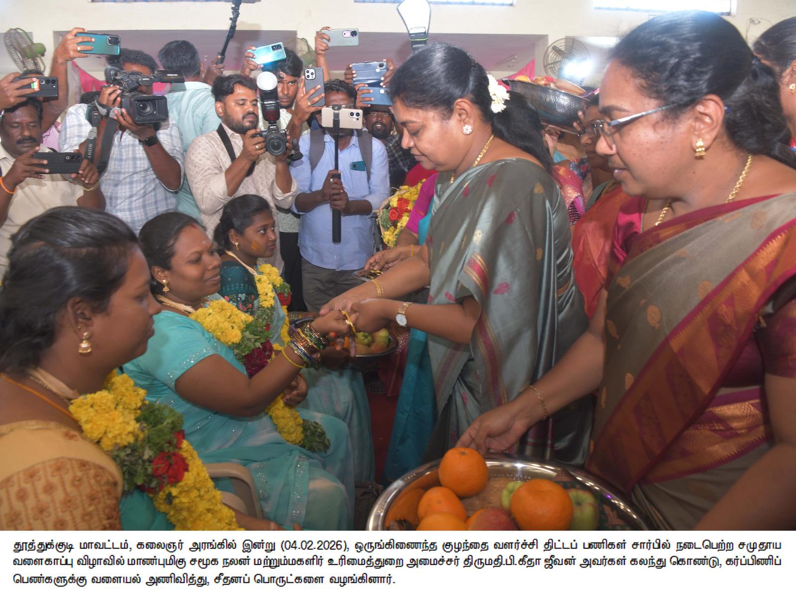 வடக்கு மாவட்ட திமுக செயலாளரும் சமூகநலன் மற்றும் மகளிர் உரிமைத்துறை அமைச்சருமான கீதாஜீவன் குத்துவிளக்கேற்றி 250 கா்ப்பிணி தாய்மாா்களுக்கு 10 வகையான சீா்வாிசை பொருட்களை வழங்கி பேசுகையில்