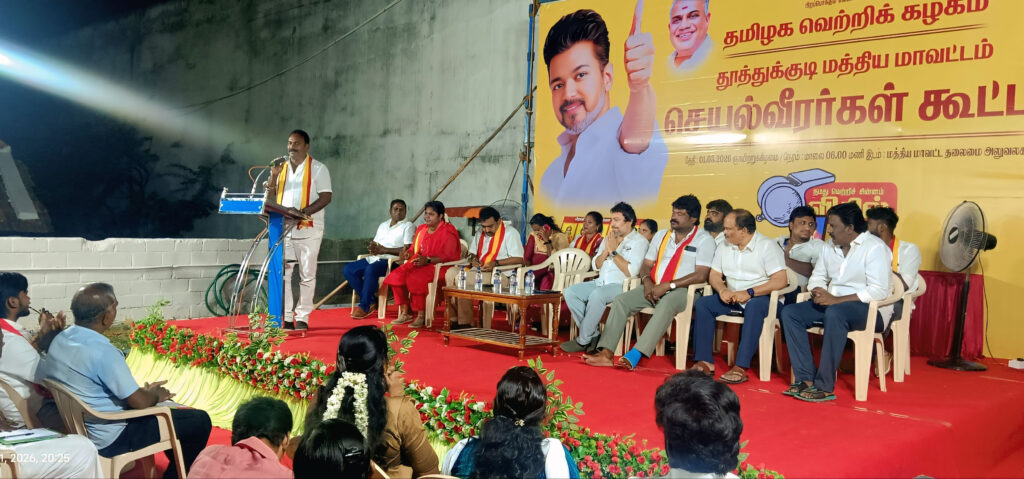 2026 தேர்தல் – தூத்துக்குடி தொகுதியில் போட்டியிடும் விஜய்? : மத்திய மாவட்ட செயற்குழு கூட்டத்தில் மாவட்டச் செயலாளர் எஸ் டி.ஆர். சாமுவேல் தலைமையில் தவெக வினர் தீர்மானம் நிறைவேற்றம்!