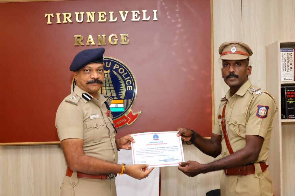 நேற்று (20.03.2026) திருநெல்வேலி சரக காவல் அலுவலகத்தில் நடைபெற்ற நிகழ்ச்சியில், நெல்லை சரக காவல்துறை துணைத் தலைவர் சரவணன் சிறப்பாகப் பணியாற்றிய அதிகாரிகளுக்கு நற்பணிச் சான்றிதழ்களை வழங்கிப் பாராட்டினார்.