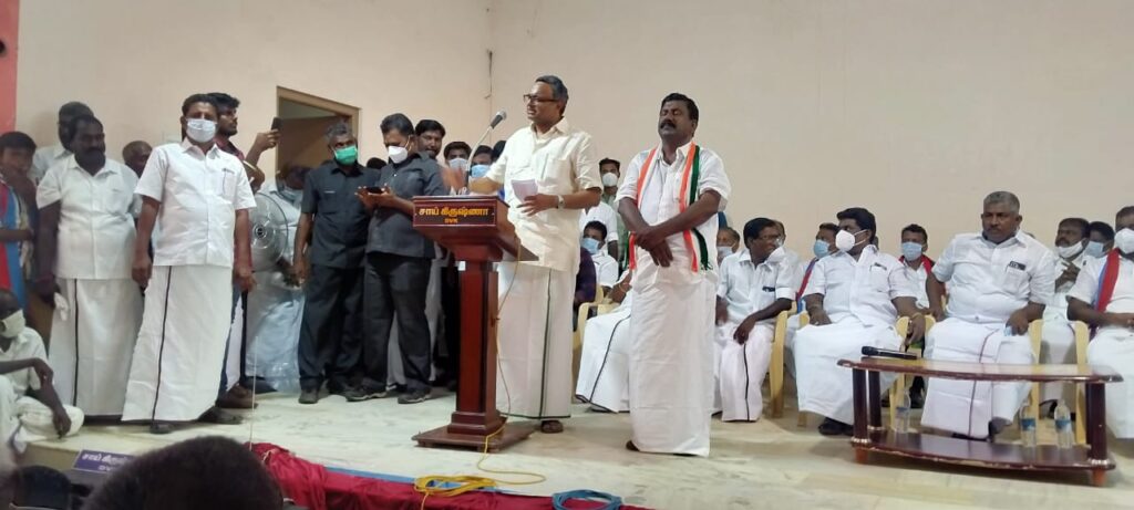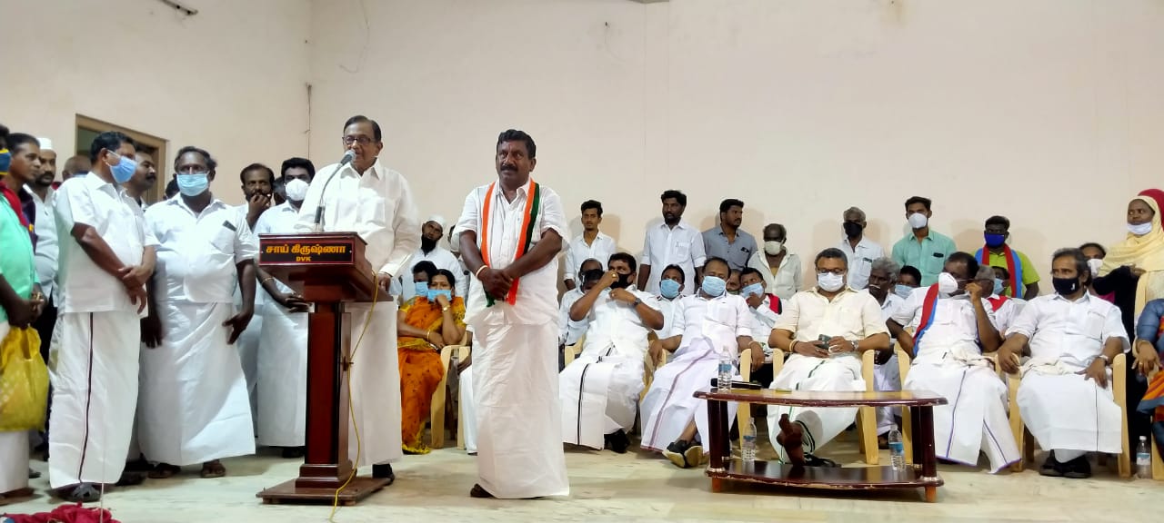 சிவகங்கை மாவட்டம் காரைக்குடி சட்டமன்ற தொகுதியில் போட்டியிடும் காங்கிரஸ் கட்சி வேட்பாளர் மாங்குடியை ஆதரித்து இன்று தேவகோட்டை தனியார் திருமண மஹாலில் முன்னாள் மத்திய அமைச்சர் ப.சிதம்பரம், சிவகங்கை நாடாளுமன்ற உறுப்பினர் கார்த்திசிதம்பரம், மற்றும் கூட்டணி கட்சி நிர்வாகிகள் கலந்து கொண்ட ஊழியர் கூட்டம் நடைபெற்றது, இந்தக் கூட்டத்தில் கார்த்திக் சிதம்பரம் பேசுகையில் மத்திய அரசு கொரோனை விட மிக மோசமான அரசு தமிழ்நாட்டில் வருவதை தடுக்க வேண்டும் என்றும், ஏழு வருடங்கள் இந்தியாவை வளர்ச்சி அடைய செய்யாமல்,மோடி அவரின் தாடியை வளர்ச்சி அடைந்துள்ளதாகவும் பேசினார், பின்னர் முன்னாள் மத்திய அமைச்சர் சிதம்பரம் பேசுகையில் ஐநா சபையில் இலங்கை மீது போர் குற்றத்தை இந்தியா ஆதரிக்காமல் வெளியேறியதை தமிழர்களுக்கு செய்யும் துரோகமாகும், அதிமுகவில் உள்ள ஓபிஎஸ், இபிஎஸ், இருவரும் மத்திய அரசு ஆட்டி வைக்கும் பொம்மை போல் உள்ளதாகவும், பஞ்சாயத்து தலைவராக இருப்பவர்களை சட்டமன்றத்திற்கு அனுப்பி வைப்போம், இன்னும் கீழ் உள்ள கட்சி தொண்டர்களை நாடாளுமன்றத்திற்கு அனுப்பி வைக்கும் ஒரே கட்சி காங்கிரஸ் கட்சி என்று பேசினார்.