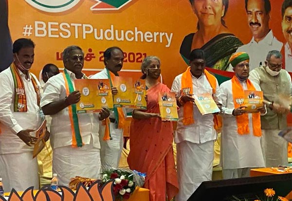 புதுச்சேரி சட்டசபை தேர்தலில் 9 தொகுதிகளில் பா.ஜ., போட்டியிடுகிறது. இதனை முன்னிட்டு அக்கட்சி தேர்தல் அறிக்கையை வெளியிட்டது. இதனை, மத்திய நிதி அமைச்சர் நிர்மலா சீதாராமன் வெளியிட்டார். ‛உங்கள் தேவையே எங்கள் வாக்குறுதி’ என்ற தலைப்பில் 50 ஆயிரம் பேரிடம் கருத்துகள்கேட்டு, தேர்தல் அறிக்கை தயாரிக்கப்பட்டு உளளது. 12 தலைப்புகளில் வாக்குறுதிகள் இடம்பெற்றுள்ளன.