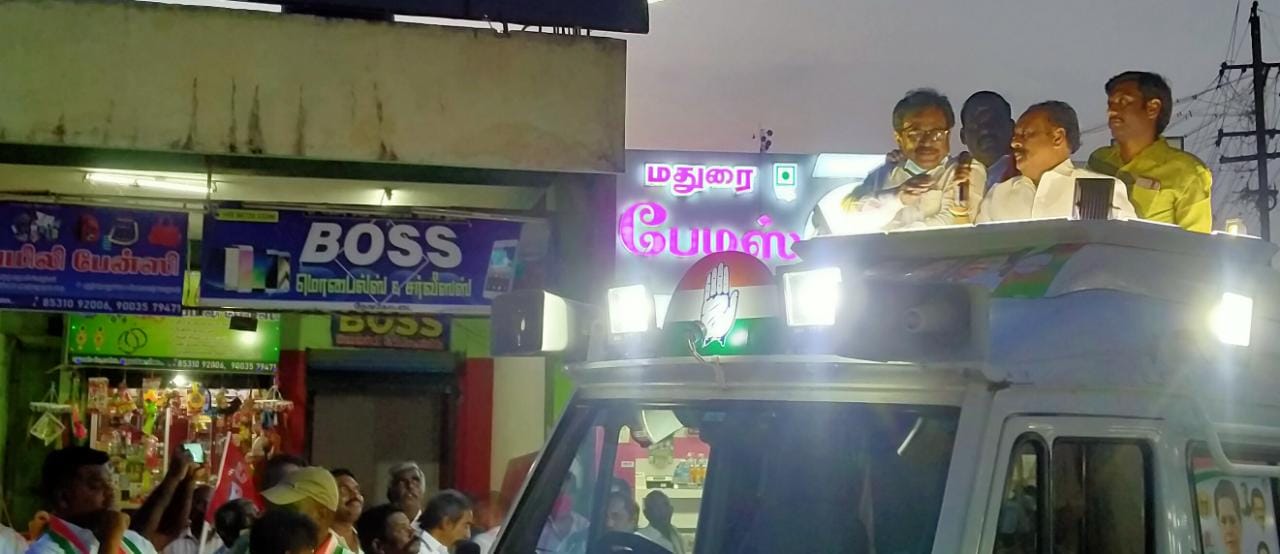 சிவகங்கை மாவட்டம் காரைக்குடி தொகுதியில் போட்டியிடும் திமுக கூட்டணி காங்கிரஸ் வேட்பாளர் மாங்குடி ஆதரித்து திருச்சி பாராளுமன்ற உறுப்பினர்