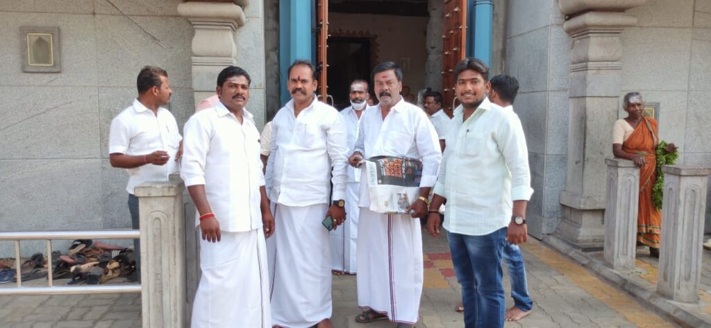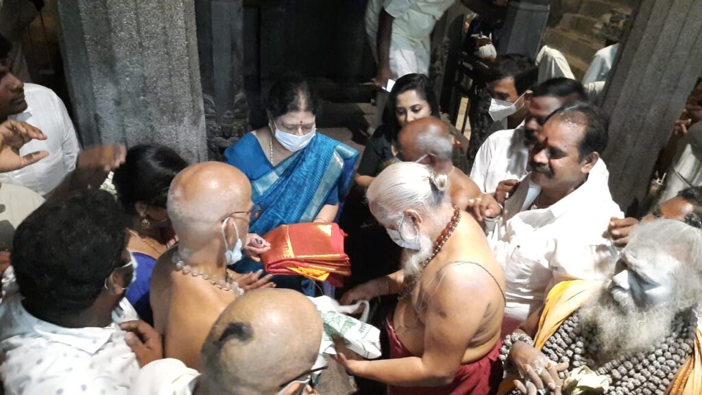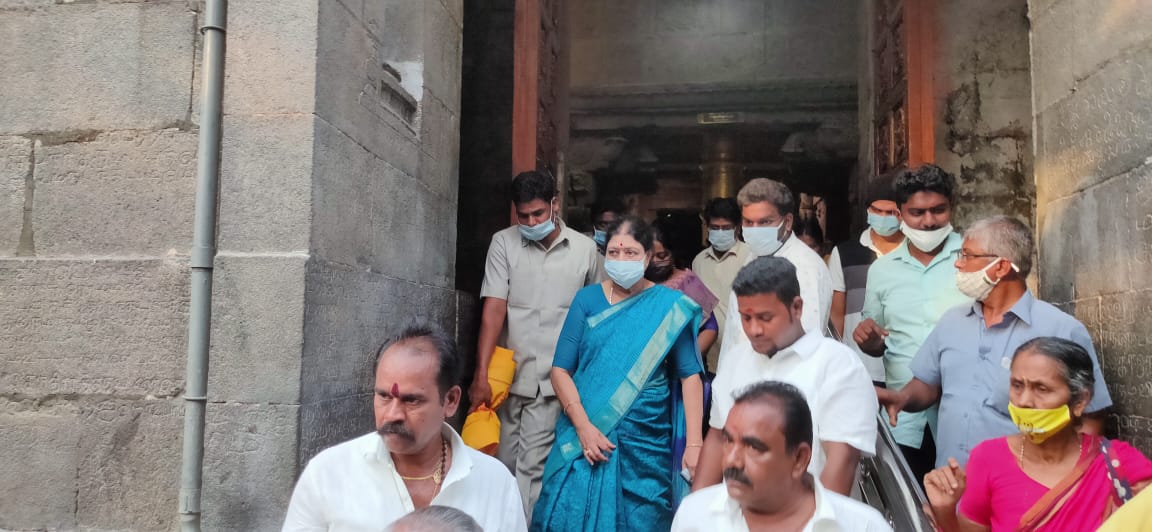 தீவிர அரசியலில் இருந்து ஒதுங்குவதாக அறிவித்திருந்த சசிகலா தமிழகத்தில் உள்ள பல்வேறு கோவில்களுக்கு சென்று சாமி தரிசனம் செய்து வருகிறார். அந்த வகையில் உலக புகழ் பெற்ற காஞ்சீபுரம் காமாட்சியம்மன் கோவிலுக்கு சென்று சாமி தரிசனம் செய்தார். அவருக்கு தியாகத்தாய் சின்னம்மா பேரவை நிறுவனத்தலைவர் சுப.தர்மலிங்கம், மாநில தலைமை நிலைய செயலாளரும், மாவட்டச் செயலாளருமான காஞ்சிபுரம் லயன் டாக்டர் கே.முத்து பட்டாடை அணிவித்து பூங்கொத்து கொடுத்து வரவேற்றனர்.