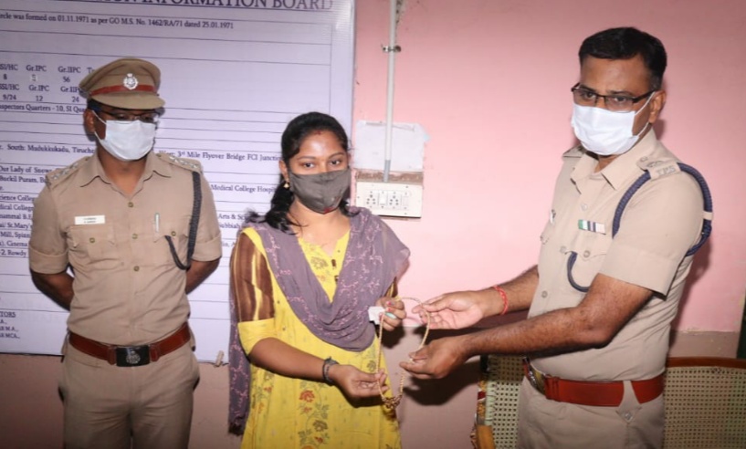 தூத்துக்குடி தென்பாகம் காவல் நிலையத்தில், மேற்படி திருடு போன சுமார் ரூபாய். 6,00,000/- மதிப்பிலான 17 பவுன் நகையை, அதன் உரிமையாளரான ரீகாந்த் மனைவி ஆஷா என்பவரிடம் மாவட்ட போலீஸ் சூப்பிரண்டு நேரில் ஒப்படைத்தார். ஆஷாவின் கணவர் ரீகாந்த்தும் உடன் வந்திருந்தார்.