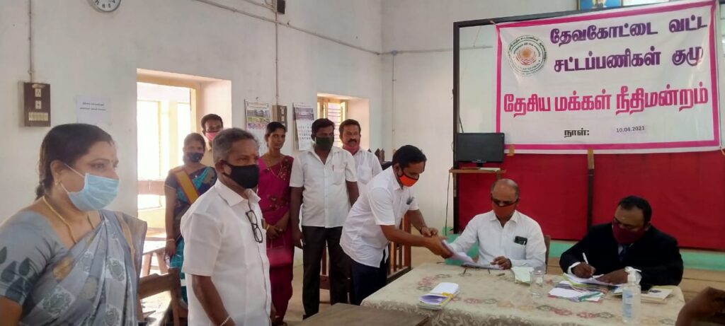 சிவகங்கை மாவட்டம் தேவகோட்டை சார்பு நீதிமன்றத்தில் சார்பு நீதிபதி M.முருகன் மாவட்ட உரிமையியல் நீதிபதி A.தரணிதரன் மற்றும் மூத்த வழக்கறிஞர்கள் குருமூர்த்தி அமர்வுகள் முன்னிலையில் (லோக் அதாலத்) தேசிய மக்கள் நீதிமன்றம் நடைபெற்றது.