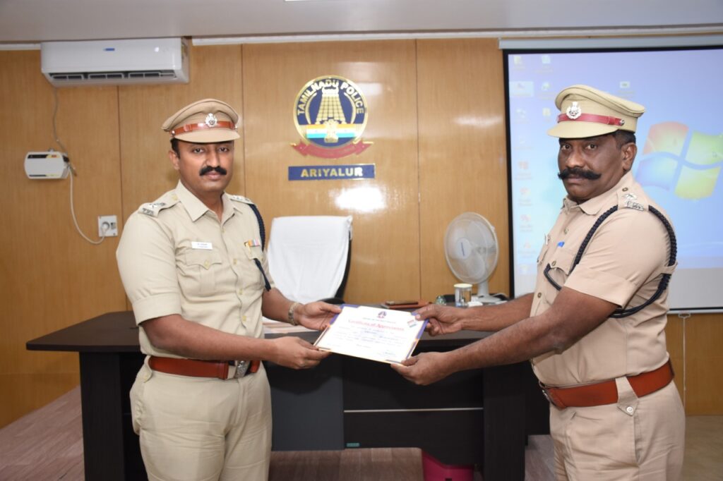 நடந்து முடிந்த தமிழ்நாடு சட்டமன்ற பொதுத் தேர்தல் 2021 -ல் சட்ட ஒழுங்கு பிரச்சினைகள் ஏற்படாமல் சிறப்பாக பணியாற்றிய காவல்துறையினருக்கும் காவல் துறையுடன் இணைந்து பொதுமக்கள் வாக்களிக்க சிறப்பாக பணிபுரிந்த என்எஸ்எஸ் மாணவர்களுக்கும் அரியலூர் மாவட்ட போலீஸ் சூப்பிரண்டு பாஸ்கரன் அவர்கள் மாவட்ட காவல் அலுவலகத்தில் 12/04/2021 இன்று பாராட்டு சான்றுகளை வழங்கி கௌரவித்தனர் காவலர்கள் முதல் உதவி ஆய்வாளர் களுக்கும் மேலுள்ள அதிகாரிகளான கூடுதல் போலீஸ் சூப்பிரண்டு வரை சிறப்பாக பணிபுரிந்தமைக்கா பாராட்டுச் சான்றிதழை பெற்றுக் கொண்டனர்.