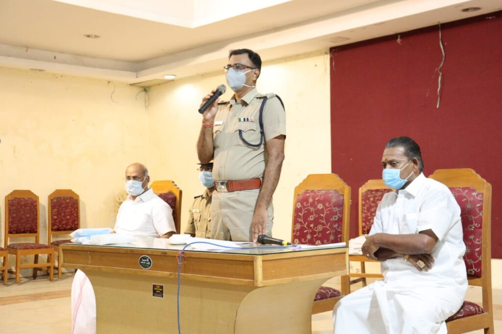 இக்கூட்டத்தில் மாவட்ட காவல் கண்காணிப்பாளர் அவர்கள் பேசுகையில் கொரோனா வைரஸ் நோய் தொற்று பரவுவதை தடுப்பதற்காக ஊரடங்கு உத்தரவு பல்வேறு கட்டுப்பாடுகளுடனும், தளர்வுகளுடனும் மத்திய அரசு வழிகாட்டுதலின்படி தமிழக அரசு பிறப்பித்துள்ளது. அதன்படி நாளை (20.04.2021) முதல் மாநிலத்தின் அனைத்து பகுதிகளிலும் இரவு 10 மணி முதல் காலை 4 மணி வரை இரவு நேர ஊரடங்கும், ஞாயிற்றுக்கிழமைகளில் முழு ஊரடங்கும் அமல்படுத்தப்பட்டுள்ளது, அதன்படி தேநீர் கடைகள், உணவு விடுதிகள், காய்கறி மற்றும் பலசரக்கு கடைகள் உட்பட அனைத்து கடைகளும், வணிக வளாகங்கள், அனைத்து ஷோரூம்கள் மற்றும் பெரிய கடைகள் ஒரே நேரத்தில் 50 சதவீத வாடிக்கையாளர்களுடன் இரவு 09.00 மணி வரை மட்டுமே செயல்பட அனுமதிக்கப்பட்டுள்ளது என்றும், முழு ஊரடங்கு அமலில் உள்ள நாட்களில் உணவகங்களில் காலை 06.00 மணி முதல் 10.00 மணி வரையிலும், நண்பகல் 12.00 மணி முதல் மதியம் 03.00 மணி வரையிலும், மாலை 06.00 மணி முதல் இரவு 09.00 மணி வரையிலும் பார்சல் சேவை மட்டும் அனுமதிக்கப்படுகிறது. Swiggy, Zomoto போன்ற மின் வணிகம் மூலம் உணவு விநியோகம் செய்யும் நிறுவனம் மேற்கண்ட நேரங்களில் மட்டும் செயல்பட அனுமதிக்கப்படுகின்றது என்றும், அதே போன்று முழு ஊரடங்கு நாட்களில் அத்தியவசிய பணிகளான பால் விநியோகம், தினசரி பத்திரிக்கை விநியோகம், மருத்துவமனைகள், மருத்துவ பரிசோதனைக்கூடங்கள், மருந்தகங்கள், ஆம்புலன்ஸ் மற்றும் அமரர் ஊர்தி சேவைகள் போன்ற மருத்துவத்துறைச் சார்ந்த பணிகள், அனைத்து சரக்கு வாகனங்கள், விவசாயிகளின் விளைப்பொருட்களை எடுத்துச் செல்லும் வாகனங்கள், எரிபொருள் எடுத்துச் செல்லும் வாகனங்கள் ஆகியவை முழு ஊரடங்கின்போது அனுமதிக்கப்படுகிறது. ஊடகம் மற்றும் பத்திரிக்கை துறையினர் தொடர்ந்து ஞாயிற்றுக்கிழமைகளிலும் பணியாற்றலாம், அத்தியவாசியப்பொருட்கள் தயாரிக்கும் தொழிற்சாலைகள் ஊரடங்கின்போதும் செயல்பட அனுமதியளிக்கப்படுகிறது. முழு ஊரடங்கு உட்பட அனைத்து நாட்களிலும் திருமணம், திருமணம் சார்ந்த நிகழ்வுகளில் 100 நபர்ளுக்கு மிகாமல் கலந்து கொள்வதில் எந்த விதமான தடையுமில்லை, தமிழ்நாட்டில் உள்ள அனைத்து கடற்கரை பகுதிகளிலும் அனைத்து நாட்களிலும் பொதுமக்களுக்கு அனுமதியில்லை. பூங்காக்கள், உயிரியல் பூங்காக்கள் மற்றும் தொல்லியல் துறையில் பாதுகாக்கப்பட்ட சின்னங்கள், அகழ்வைப்பகங்கள் மற்றும் அருங்காட்சியகங்கள் ஆகியவற்றிற்கு அனைத்து நாட்களிலும் பொதுமக்களுக்கு அனுமதியில்லை. மாநிலத்தின் அனைத்து பகுதிகளிலும் ஞாயிற்று கிழமைகளில் முழு ஊரடங்கு அமல்படுத்தப்படும். அன்றைய தினம் இறைச்சி கடைகள், மீன் மார்க்கெட், காய்கறி கடைகள், திரையங்குகள், வணிக வளாகங்க