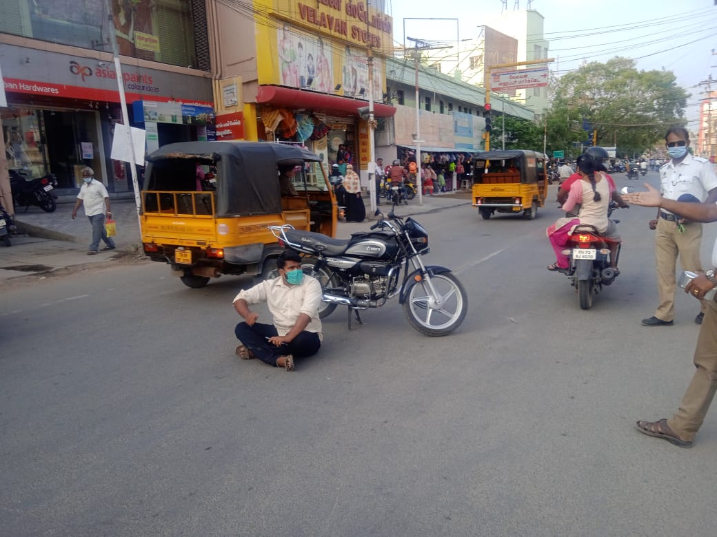 கீழே அமர்ந்து போலீசாரை கண்டித்து திடீரென கோஷம் போட துவங்கினார். வாலிபர் ஒருவர் தரையில் அமர்ந்து கொண்டு போலீசாரை கண்டித்து கோஷம் போட்டது அப்பகுதியில் பெரும் பரபரப்பை ஏற்படுத்தியது போக்குவரத்து ஆய்வாளர் மத்திய பாகம் காவல் ஆய்வாளருக்கு தகவல் தெரிவித்ததால் மத்திய பாகம் போலீசார் அந்த வாலிபரிடம் விசாரணை நடத்தி வருகிறார்கள. மாஸ்க் போடாத நபர்கள் நிறுத்தி போலீசார் அறிவுரை வழங்கி வரும் நிலையில் பல இடங்களில் போலீசாருக்கும் பொதுமக்களுக்கும் வாக்குவாதம் நடந்து வருகிறது கொரனோ தொற்று காலத்தில் பொதுமக்கள் காவல்துறையினருக்கும் சுகாதாரத் துறை அதிகாரிகளுக்கும் ஒத்துழைப்பு கொடுக்க வேண்டும் என பொதுமக்கள் சார்பில் கேட்டுக்கொள்ளப்படுகிறது