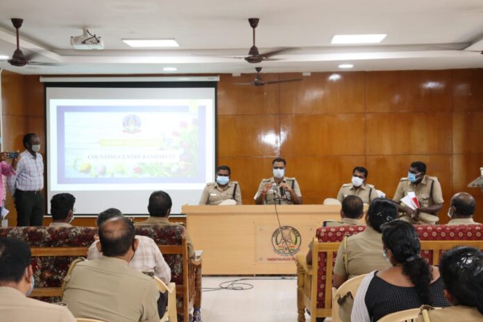 தூத்துக்குடி மாவட்டத்தில் வாக்கு எண்ணும் மையத்திற்குள் யார், யார் அனுமதிக்கப்படுவார்கள், எந்த வழியாக வரலாம், என்னென்ன கொண்டு வரலாம் என்றும் பாதுகாப்பு ஏற்பாடுகள் குறித்து காவல்துறை அதிகாரிகளுடன் மாவட்ட காவல் கண்காணிப்பாளர் எஸ். ஜெயக்குமார் தலைமையில் விளக்ககூட்டம்.