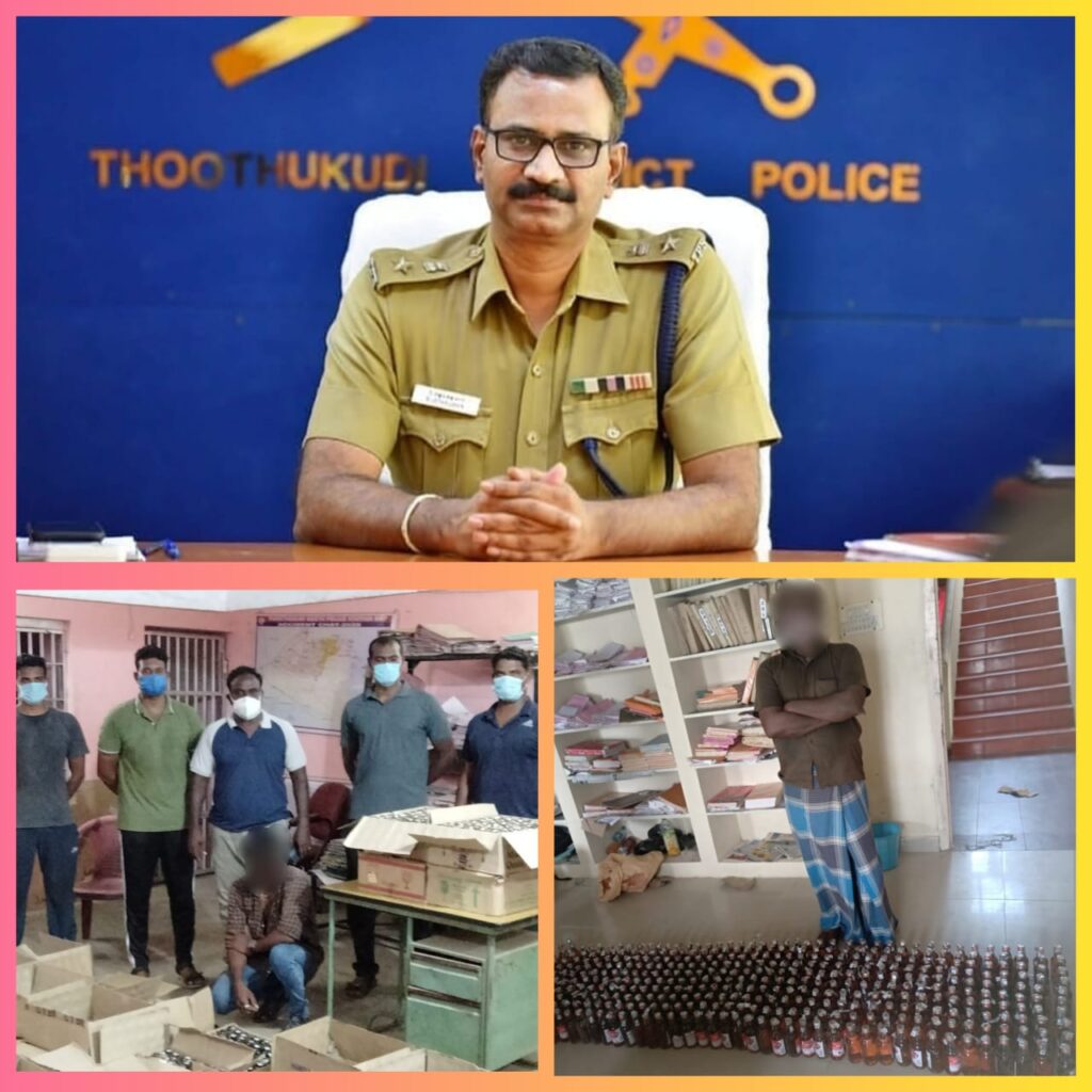 சட்டவிரோதமாக மதுவிற்பனை நடைபெறுவதாக வந்த புகாரை அடுத்து தூத்துக்குடி எஸ்பி ஜெயக்குமார் உத்தரவு பெயரில் மாவட்டம் முழுவதும் அதிக அளவு மதுபாட்டில்களை பதுக்கி வைத்திருந்தவர்களை கைது செய்து அதிரடி நடவடிக்கை எடுத்தார் தூத்துக்குடி தென்பாகம் காவல் நிலைய உதவி ஆய்வாளர் திரு. வேல்ராஜ் இவர் தலைமையிலான தனிப்படை மற்றும் திருச்செந்தூர் தாலுகா காவல் நிலைய உதவி ஆய்வாளர்கள் திரு. சுந்தரம் தலைமையிலான போலீசாருக்கு மாவட்ட காவல் கண்காணிப்பாளர் திரு. எஸ். ஜெயக்குமார் அவர்கள் பாராட்டு தெரிவித்தார்.