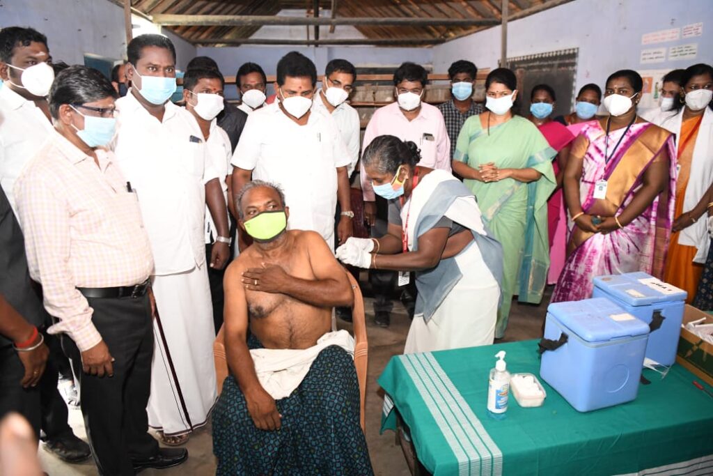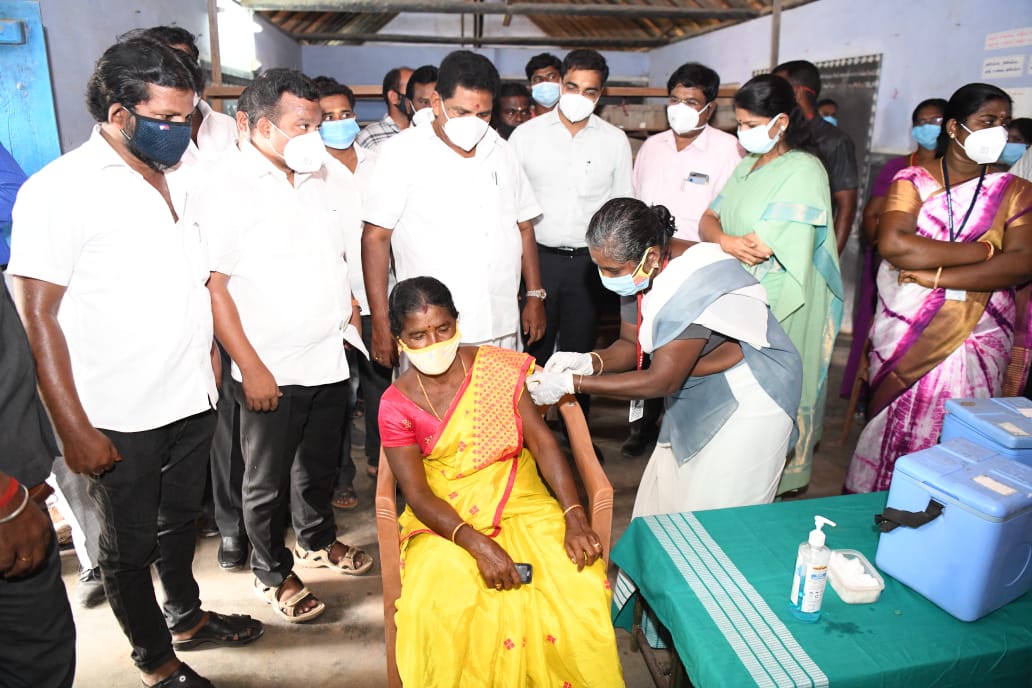 தூத்துக்குடி மாப்பிள்ளை யூரணியில் covid-19 தடுப்பூசி போடும் முகாமினை மாண்புமிகு தூத்துக்குடி நாடாளுமன்ற உறுப்பினர் அவர்களும், மாண்புமிகு மீன் வளம் மீனவர் நலம் மற்றும் கால்நடை துறை அமைச்சர் அவர்களும்துவக்கி வைத்தார்கள் அருகில் மாவட்ட ஆட்சித் தலைவர் டாக்டர். செந்தில் ராஜ் இ.ஆ.ப. அவர்கள், மாவட்ட வருவாய் அலுவலர் திரு கண்ணபிரான், தூத்துக்குடி ஒன்றிய குழு தலைவர் திருமதி வாசுமதி அம்பாசங்கர் , துணை இயக்குனர் சுகாதாரப்பணிகள் த டாக்டர் போஸ்கோ ராஜா மற்றும் முக்கிய பிரமுகர்கள் உள்ளனர்.