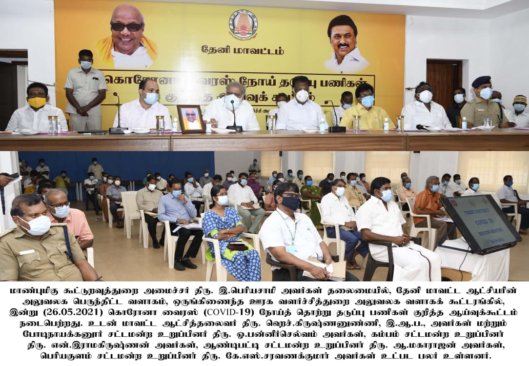 மாண்புமிகு கூட்டுறவுத்துறை அமைச்சர் இ.பெரியசாமி தலைமையில் தேனி மாவட்ட ஆட்சியரின் அலுவலக பெருந்திட்ட வளாகம் ஒருங்கிணைந்த ஊரக வளர்ச்சித்துறை அலுவலக வளாகக் கூட்டரங்கில் கொரோனா வைரஸ் நோய்த் தொற்று தடுப்பு பணிகள் குறித்த ஆய்வுக்கூட்டம் மாவட்ட ஆட்சித்தலைவர் ஹெச்.கிருஷ்ணனுண்ணி மற்றும் போடிநாயக்கனூர் சட்டமன்ற உறுப்பினர் ஓ.பன்னீர்செல்வம் , கம்பம் சட்டமன்ற உறுப்பினர் என்.இராமகிருஷ்ணன், ஆண்டிபட்டி சட்டமன்ற உறுப்பினர் திரு. ஆ.மகாராஜன் ,பெரியகுளம் சட்டமன்ற உறுப்பினர் கே.எஸ்.சரவணக்குமார் அவர்கள் ஆகியோர் முன்னிலையில் நடைபெற்றது.