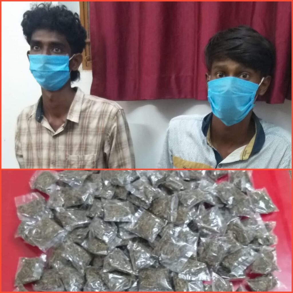 கோவில்பட்டி காவல் துணை கண்காணிப்பாளர் திரு. கலைக்கதிரவன் அவர்கள் உத்தரவின் பேரில் கோவில்பட்டி கிழக்கு காவல் நிலைய ஆய்வாளர் திரு. தங்கராஜ் தலைமையில் தனிப்பிரிவு உதவி ஆய்வாளர் திரு. ஸ்டீபன் மற்றும் போலீசார் நேற்று மாலை ரோந்து சென்ற போது கோவில்பட்டி காமராஜர் தெருவைச் சேர்ந்த தங்கப்பசாமி மகன் தங்கராஜ் (24) மற்றும் கோவில்பட்டி நேரு தெருவைச் சேர்ந்த முனியசெல்வம் மகன் முனியசாமி என்ற கார்த்திக் (20) ஆகிய இருவரும் கோவில்பட்டி தங்கப்பநாடார் நந்தவனம் செல்லும் குறிஞ்சான்குளம் கண்மாய் அருகில் கஞ்சா விற்பனை செய்து கொண்டிருந்தது தெரியவந்தது. உடனே மேற்படி போலீசார் அவர்களை கைது செய்து, சோதனை செய்ததில் 8 கிராம் எடை கொண்ட 153 கஞ்சா பாக்கெட்டுகளும், 2 கிராம் எடை கொண்ட 125 கஞ்சா பாக்கெட்டுகளும், பாக்கெட்டுகளை சீல் வைக்கக்கூடிய மெஷின் மற்றும் எடை மெஷினும் இருப்பது கண்டு பிடிக்கப்பட்டு, அவற்றை பறிமுதல் செய்தனர். மேற்படி மொத்த கஞ்சாவின் எடை சுமார் 1.500 கிலோ கிராம் ஆகும்.
