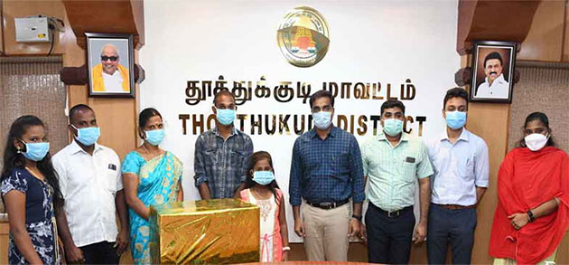 இதைத்தொடர்ந்து மாவட்ட ஆட்சியர் செந்தில்ராஜ் நேற்று சிறுமி புனிதாவை ஆட்சியர் அலுவலகத்துக்கு வரவழைத்தார். அங்கு அவரை பாராட்டி பரிசு பொருட்களை வழங்கினார். அப்போது மாவட்ட வருவாய் அலுவலர் கண்ணபிரான், உதவி ஆட்சியர் (பயிற்சி) ஸ்ருதஞ்ஜெய் நாராயணன், திருச்செந்தூர் கோட்டாட்சியயர் தனப்பிரியா, சிறுமியின் பெற்றோர் மாயாண்டி, ஜென்சி மற்றும் அலுவலர்கள் உடன் இருந்தனர்.