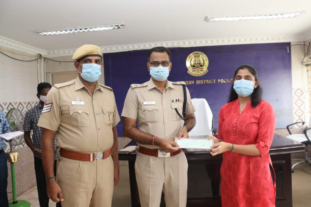 பட்டப்படிப்பில் அதிக மதிப்பெண்கள் பெற்ற தலைமைக் காவலர் கண்ணன் மகள் சிதம்பர செல்வி ஆகியோருக்கு சிறப்பு கல்வி ஊக்கத் தொகையை இன்று (09.06.2021) மாவட்ட காவல்துறை அலுவலகத்தில் மாவட்ட காவல் கண்காணிப்பாளர் எஸ் ஜெயக்குமார் வழங்கி, அனைத்து துறைகளிலும் சிறந்து விளங்க வாழ்த்தினார்.