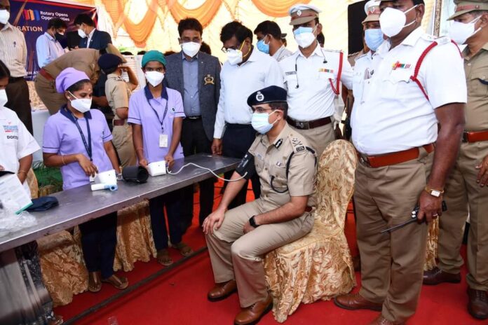 பணியில் உள்ள காவலர்களின் உடல் நலன் காக்கும் மருத்துவகுழுக்கள் அமைக்க போலீஸ் கமிஷனர் உத்தரவு. போக்குவரத்து கூடுதல் கமிஷனர் முகாமை துவக்கி வைத்து, கொரோனா தடுப்பு தொகுப்பினை காவலர்களுக்கு வழங்கினார்.