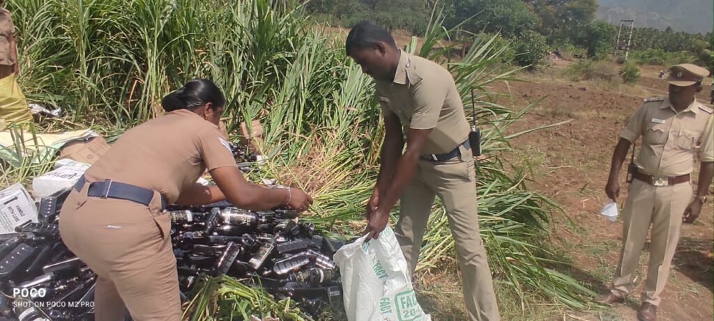 தேனி மாவட்டம் பெரியகுளம் அருகேயுள்ள தேவதானப்பட்டி பகுதியில் தனியார் தோட்டத்தில் பதுக்கி வைக்கப்பட்டிருந்த சுமார் 3100 வெளி மாநில மதுபாட்டில்களை போலீசார் பறிமுதல் செய்தனர். கோவாவில் இருந்து கேரள மாநிலத்திற்குக் கடத்தி வரப்பட்ட சுமார் 3100 ( 750 மில்லி அளவுடையவை) மதுபாட்டில்களை தேவதானப்பட்டி அருகேயுள்ள புல்லக்கா பட்டி பகுதியில் தனியாருக்கு சொந்தமான தோப்பில் பதுக்கி வைத்திருந்தது குறித்து பெரியகுளம் சரக காவல் துணை கண்காணிப்பாளர் முத்துக்குமார் அவர்களுக்கு கிடைத்த ரகசிய தகவலின் படி, மாவட்ட காவல் கண்காணிப்பாளர் பிரவின் உமேஷ் டோங்கரே அவர்களின் வழிகாட்டுதலின் படி தேவதானப்பட்டி காவல் நிலைய ஆய்வாளர் முத்துமணி தலைமையில் தனிப்படை அமைத்து போலீசார் தேடுதல் வேட்டை நடத்தி ரவி என்பவரது தோட்டத்தில் பதுக்கி வைக்கப்பட்டிருந்த சுமார் 3100 வெளி மாநில மதுபாட்டில்களை கண்டுபிடித்தனர்.