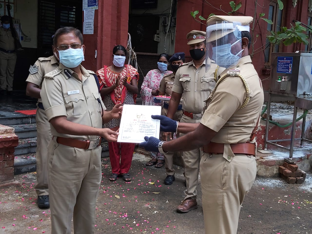 கொரோனா சிகிச்சை பெற்று குணமடைந்து பணிக்கு திரும்பிய உதவி ஆய்வாளர் முருகன் அவர்களுக்கு பூக்கடை சரக துணை ஆணையர். ராஜேந்திரன். அவர்கள் பூங்கொத்து கொடுத்து சான்றிதழ் வழங்கி வாழ்த்து தெரிவித்தார்.