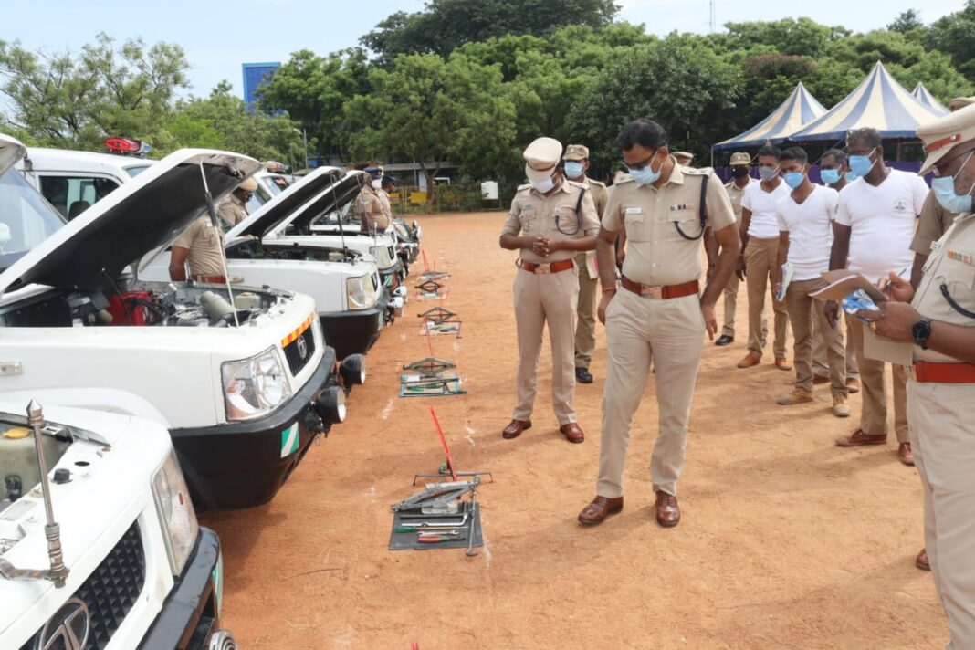 இன்று தூத்துக்குடி மாவட்ட காவல்துறை அலுவலக மைதானத்தில் கனரக வாகனங்கள் 18, நான்கு சக்கர வாகனங்கள் 77 மற்றும் இரு சக்கர வாகனங்கள் 55 மொத்தம் 150 வாகனங்களை மாவட்ட காவல் கண்காணிப்பாளர் எஸ். ஜெயக்குமார் ஆய்வு செய்தார்.