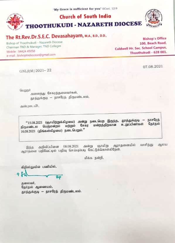 தூத்துக்குடி நாசரேத் திருமண்டல பெருமன்ற மற்றும் சேகர் மன்ற உறுப்பினர் பதவிக்கான தேர்தல் தேதி அதிரடியாக மாற்றப்பட்டுள்ளது இதுகுறித்து நாசரேத் திருமண்டல பேராயர் தெரிவித்த தகவல் 15 8 2021 அன்று நடைபெற இருந்த இந்த தேர்தல் குறிப்பாக ஞாயிற்றுக்கிழமை நடைபெற இருந்த நிலையில் திடீரென தேர்தல் திங்கட்கிழமை அதாவது 16/08/2021 அன்று நடைபெறும் என தெரிவிக்கப்பட்டுள்ளது.