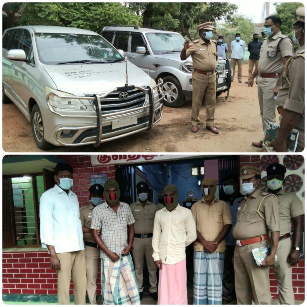 அவரது உத்தரவின்பேரில் மேற்படி தனிப்படை போலீசார் பல்வேறு கோணங்களில் விசாரணை மேற்கொண்டும், செல்போன் எண்களை வைத்து ஆய்வு செய்து எதிரிகளை தேடி வந்தனர். இந்நிலையில் இன்று (11.08.2021) தனிப்படை போலீசார் ரோந்து சென்ற போது குளத்தூர் காவல் நிலைய எல்லைக்குட்பட்ட கலைஞானபுரம் அருகே ஏற்கனவே தேடி வந்த எதிரிகளின் இன்னோவா கார் வருவதையறிந்த போலீசார் மேற்படி காரை மடக்கிப்பிடித்தனர். அந்தக் காரில் ஸ்கார்பியோ காரை கடத்திச் சென்ற எதிரிகளான சாயல்குடி கடலாடியைச் சேர்ந்த 1) மூக்கையா மகன் ஜெயக்குமார் (30), அதே பகுதியைச் சேர்ந்த 2) சீனிமுகமது மகன் லத்தீப் மற்றும் 3) முருகேசன் மகன் செந்தூர் என்ற திராவிடமணி (36) ஆகியோர் இருந்தது கண்டுபிடிக்கப்பட்டு, அவர்கள் 3 பேரையும் கைது செய்து விசாரணை மேற்கொண்டதில் சிவகங்கையைச் சேர்ந்த கடத்தப்பட்ட ஸ்கார்பியோ காரின் உரிமையாளரான கோதண்டபாணி என்பவருக்கும் மேற்படி மூக்கையா குடும்பத்தாருக்கும் கொடுக்கல் வாங்கல் பிரச்சனையில் முன்விரோதம் இருந்து வந்துள்ளதும், அதன் காரணமாக மேற்படி ஸ்கார்பியோ காரில் வந்தவர்களை தாக்கி அந்தக் காரை பறித்துச் சென்றதும் விசாரணையில் தெரியவந்தது. மேலும் அவர்களிடம் விசாரணை செய்ததில் தருவைக்குளத்தைச் சேர்ந்த மற்ற 2 எதிரிகளின் வீட்டில் ஸ்கார்பியோ காரை மறைத்து வைத்திருப்பதாக கொடுத்த தகவலின் பேரில் மேற்படி தனிப்படை போலீசார் தருவைக்குளம் சென்று அங்கு மறைத்து வைத்திருந்த ஸ்கார்பியோ காரையும் பறிமுதல் செய்தனர். மேலும் எதிரிகள் குற்ற சம்பவத்திற்கு பயன்படுத்திய இன்னோவா காரையும் பறிமுதல் செய்தனர். இவ்வழக்கின் மற்ற எதிரிகளான சாயல்குடி கடலாடியைச் சேர்ந்தவர்களான வீரபுத்திரன் மகன் மூக்கையா (60), அவரது மகன்கள் ஜெயபுத்திரன் (32), ஜெயச்சந்திரன் (28) ஆகிய 3 பேரும் நீதிமன்றத்தில் முன்ஜாமீன் பெற்றுள்ளனர். இது தவிர தலைமறைவாக உள்ள மற்ற 2 எதிரிகளை தனிப்படை போலீசார் தீவிரமாக தேடி வருகின்றனர்.