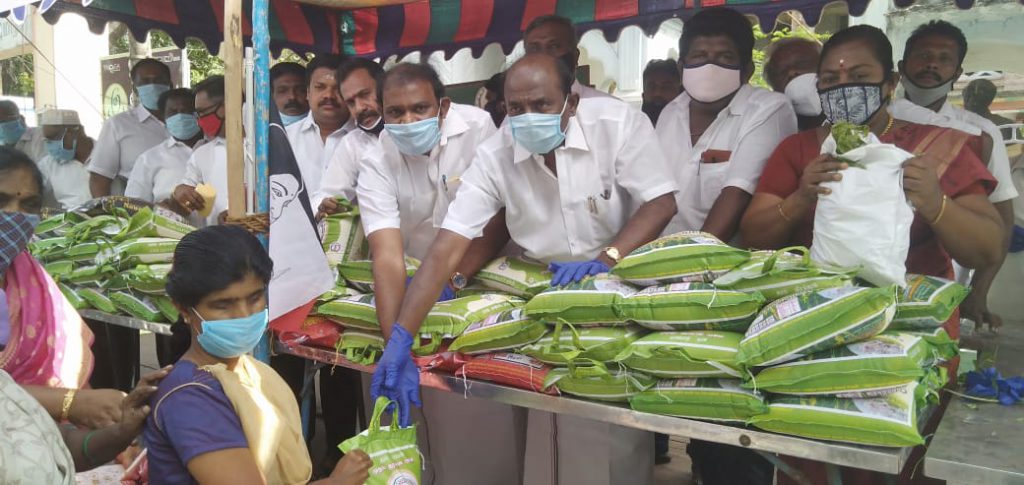 தூத்துக்குடியில் 2300 ஏழை, எளிய குடும்பங்களுக்கு அரிசி, காய்கறிகள், முக கவசம், அடங்கிய தொகுப்புகளை கழக அமைப்பு செயலாளர் ஹென்றி தாமஸ் தலைமையில் வழங்கப்பட்டது.