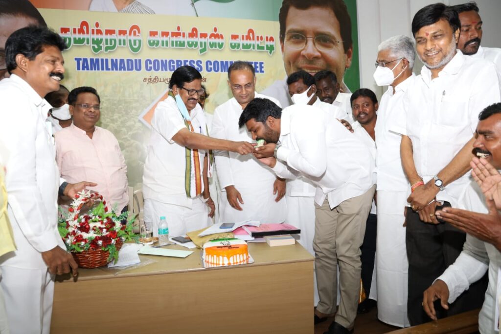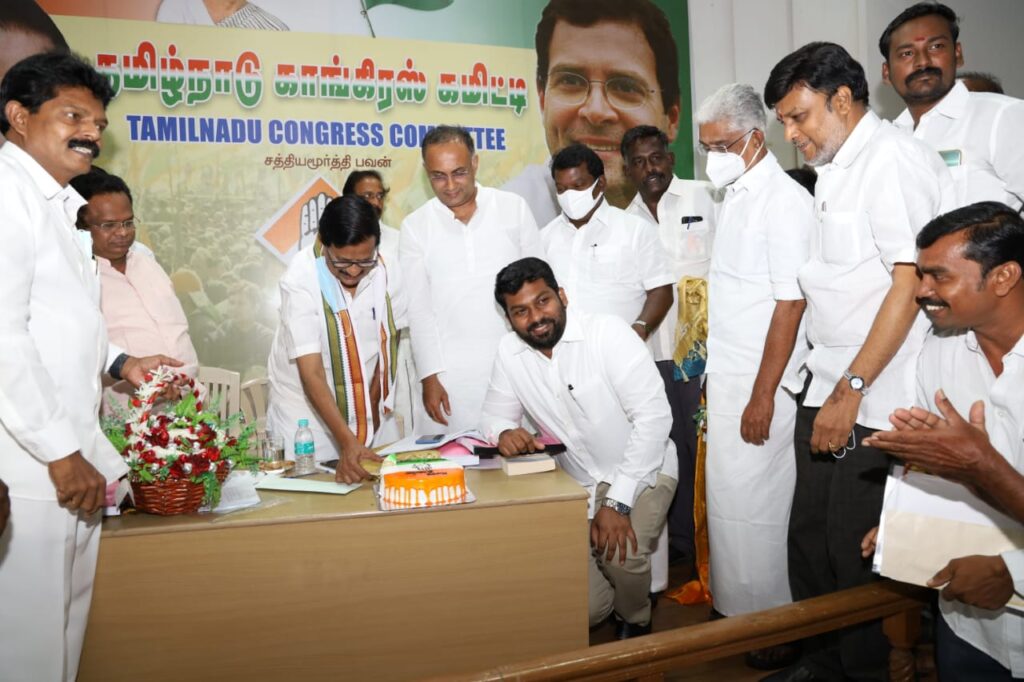 தமிழ்நாடு காங்கிரஸ் கமிட்டி தலைவர் கே எஸ் அழகிரி அவர்கள், மற்றும் தமிழ்நாடு காங்கிரஸ் கமிட்டி மேலிட பார்வையாளர் தினேஸ்குண்டுராவ் ஆகியோர் முன்னிலையில் கேக் வெட்டப்பட்டு வெகு சிறப்பாக கொண்டாடப்பட்டது.