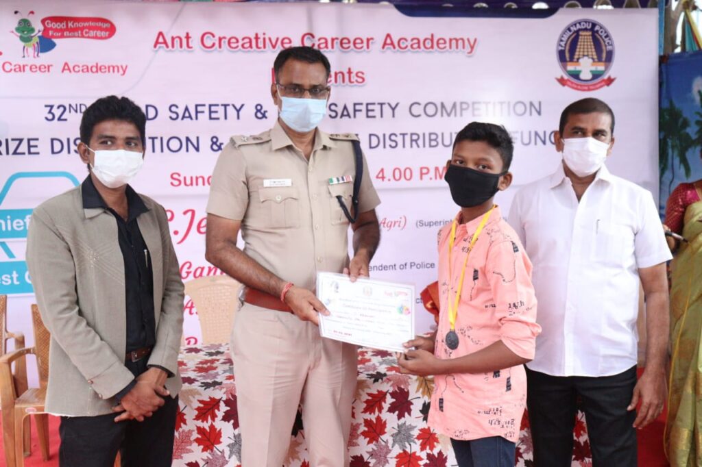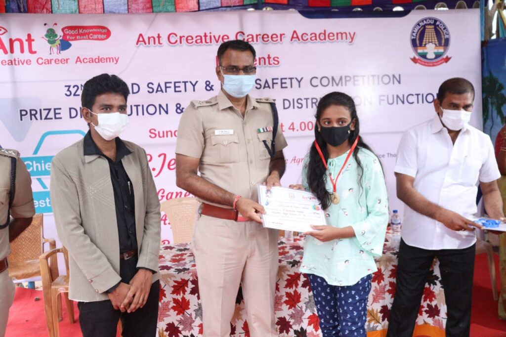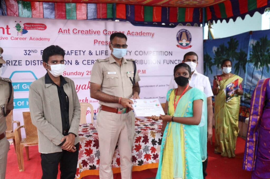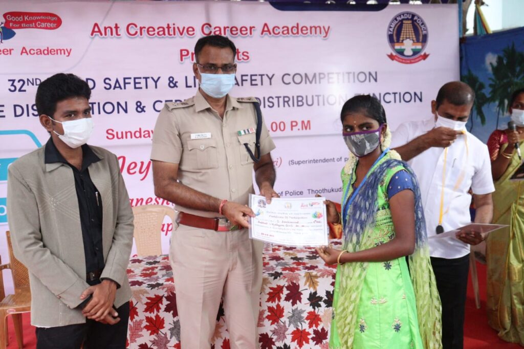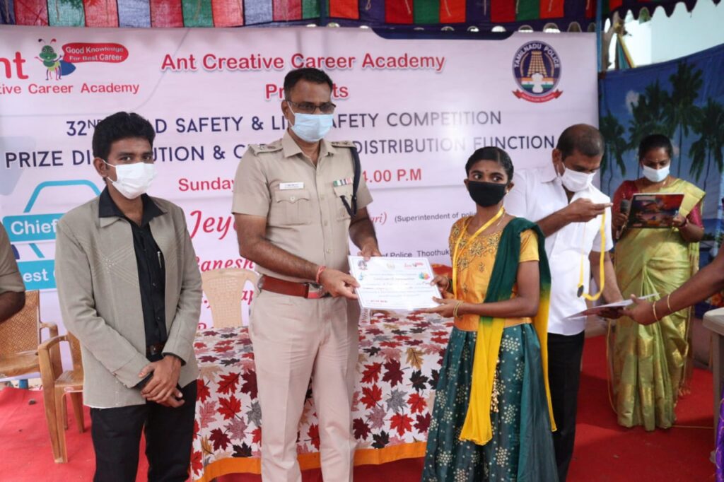 தூத்துக்குடியில் மாவட்ட காவல்துறை மற்றும் ஆன்ட் கிரியேட்டிவ் கேரியர் அகாடமி சார்பாக 32வது சாலை பாதுகாப்பு மாதத்தை முன்னிட்டு சாலைபாதுகாப்பு குறித்த வினாடிவினா, ஓவிய போட்டிகள் ஆன்லைனில் நடைபெற்றது. இப்போட்டியில் பங்கு பெற்று வெற்றி பெற்ற மாணவ மாணவிகளுக்கு பரிசுகள் மற்றும் சான்றிதழ் வழங்கும் விழா 29.08.2021 டூவிபுரம் பகுதியில் உள்ள ஆன்ட் கிரியேட்டிவ் அகாடமியில் நடைபெற்றது. இவ்விழாவில் மாவட்ட காவல் கண்காணிப்பாளர் திரு. எஸ். ஜெயக்குமார் அவர்கள் தலைமை விருந்தினராக கலந்து கொண்டு வெற்றி பெற்றவர்களுக்கு சான்றிதழ் மற்றும் பரிசுகளை வழங்கி பாராட்டினார்.