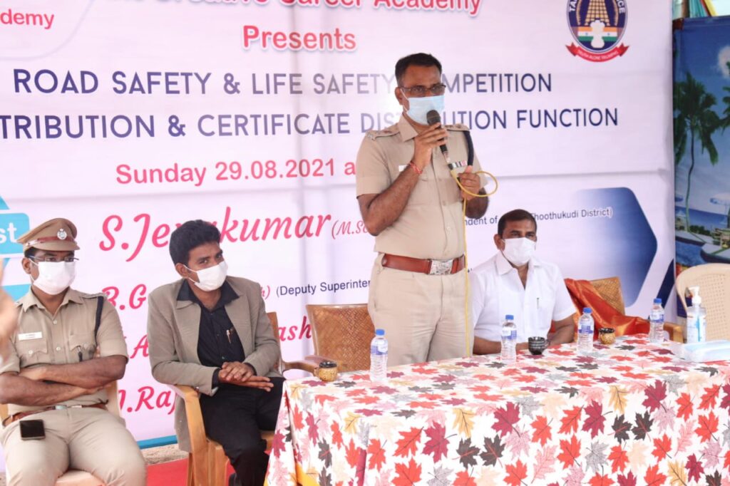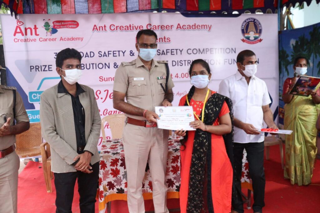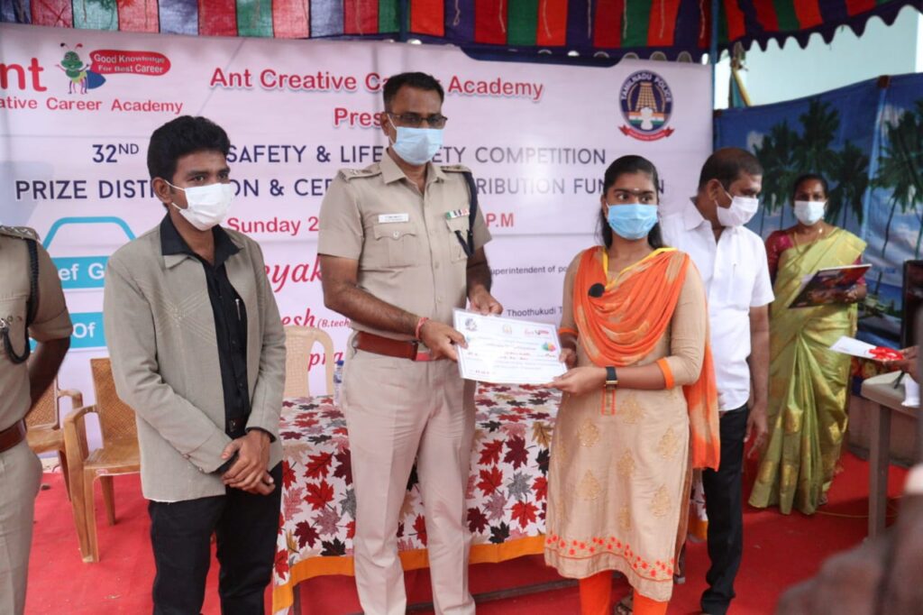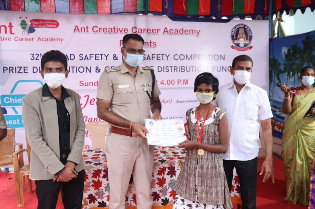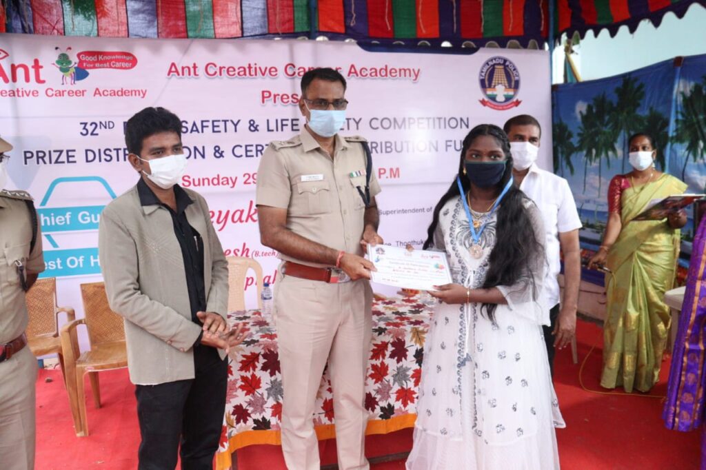 தூத்துக்குடியில் மாவட்ட காவல்துறை மற்றும் ஆன்ட் கிரியேட்டிவ் கேரியர் அகாடமி சார்பாக 32வது சாலை பாதுகாப்பு மாதத்தை முன்னிட்டு சாலைபாதுகாப்பு குறித்த வினாடிவினா, ஓவிய போட்டிகள் ஆன்லைனில் நடைபெற்றது. இப்போட்டியில் பங்கு பெற்று வெற்றி பெற்ற மாணவ மாணவிகளுக்கு பரிசுகள் மற்றும் சான்றிதழ் வழங்கும் விழா 29.08.2021 டூவிபுரம் பகுதியில் உள்ள ஆன்ட் கிரியேட்டிவ் அகாடமியில் நடைபெற்றது. இவ்விழாவில் மாவட்ட காவல் கண்காணிப்பாளர் திரு. எஸ். ஜெயக்குமார் அவர்கள் தலைமை விருந்தினராக கலந்து கொண்டு வெற்றி பெற்றவர்களுக்கு சான்றிதழ் மற்றும் பரிசுகளை வழங்கி பாராட்டினார்.