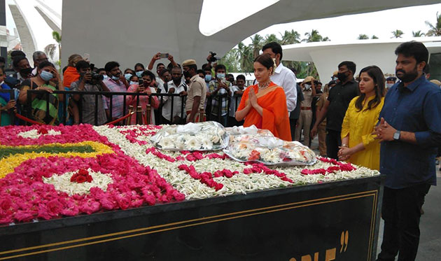 ஆர்.எம்.வீரப்பனாக சமுத்திரக்கனி, எம்.ஜி.ஆரின் மனைவி ஜானகி கதாபாத்திரத்தில் மதுபாலா, சசிகலாவாக பூர்ணா ஆகியோரும் நடித்துள்ளனர். விஜய் இயக்கி உள்ளார். வரும் 10ம் தேதி ‘தலைவி’ திரைப்படம் வெளியாக உள்ளது. இதை தொடர்ந்து இன்று சென்னை, மெரினாவில் உள்ள முன்னாள் முதல்- அமைச்சர் ஜெயலலிதா நினைவிடத்தில் நடிகை கங்கனா ரணாவத் மரியாதை செலுத்தினார்.