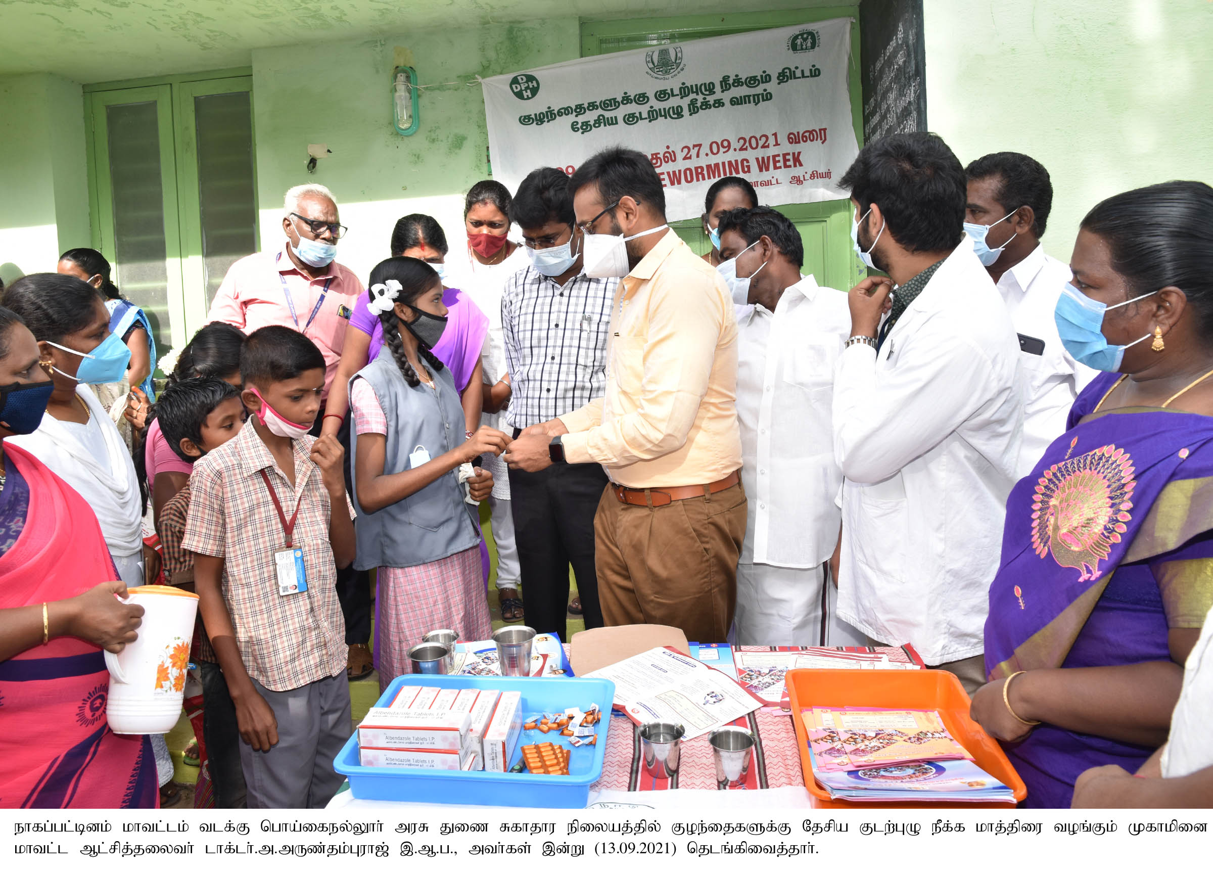 நாகப்பட்டினம் மாவட்டத்தில் இன்று (13.09.2021) வடக்கு பொய்கைநல்லூர் அரசு துணை சுகாதார நிலையத்தில் குழந்தைகளுக்கு தேசிய குடற்புழு நீக்க மாத்திரை வழங்கும் முகாமினை மாவட்ட ஆட்சித்தலைவர் டாக்டர்.அ.அருண்தம்புராஜ் இ.ஆ.ப., அவர்கள் தெடங்கிவைத்தார்.