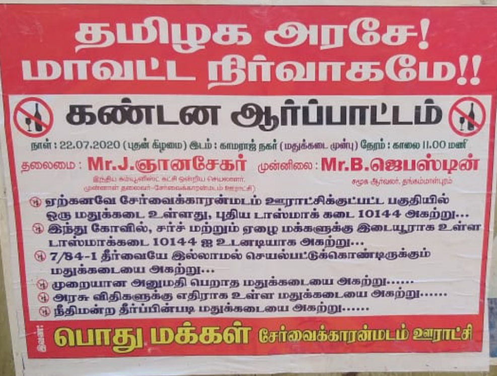 ஆர்ப்பாட்டத்திற்கு, முன்னாள் பஞ்சாயத்து தலைவரும், இ.கம்யூ, கட்சியின் ஒன்றிய செயலாளருமான ஞானசேகர் தங்கம்மாள்புரம் சமூகஆர்வலர் ஜெபஸ்டின் முன்னிலை வகிக்கிறார். என செய்தி குறிப்பு வெளியாகின. இது தவறான போக்கு மாவட்ட நிர்வாகம்,