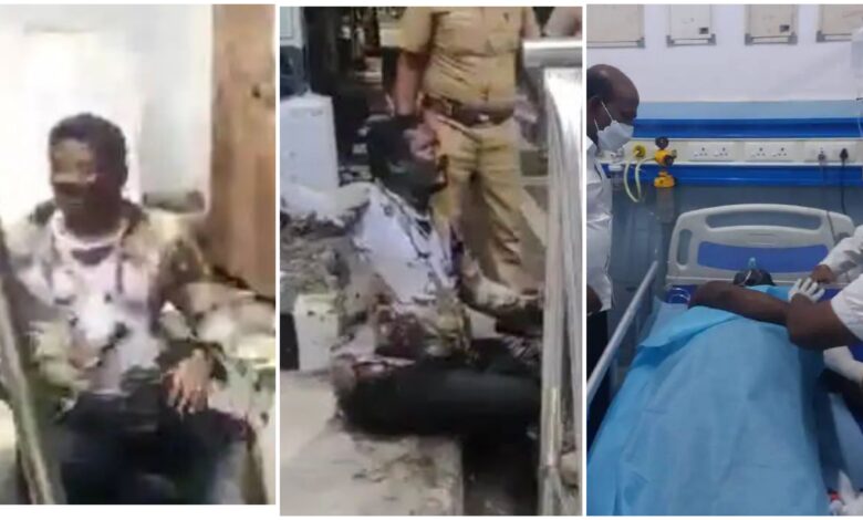 இதை பார்த்ததும் பாதுகாப்புக்கு நின்ற போலீஸார் தீயை அணைத்து கீழ்பாக்கம் மருத்துவமனையில் வெற்றி வேலை சிகிச்சைக்கு சேர்த்தனர். வெற்றிவேல் உடலில் 40% தீக்காயம் ஏற்பட்டுள்ளது என்பதால் அவர் மிகவும் ஆபத்தான நிலையில் இருக்கிறார். சம்பவம் குறித்து கேள்விப்பட்டதும் சுகாதாரத்துறை அமைச்சர் அமைச்சர் மா. சுப்பிரமணியம் மருத்துவமனை செல்கிறார்.
