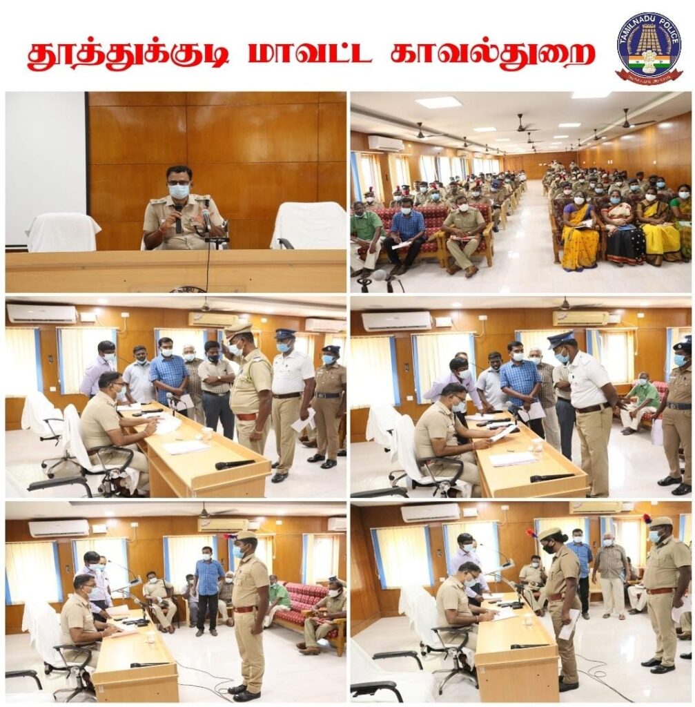 தமிழ்நாடு காவல்துறை தலைமை இயக்குனர் அவர்களின் உத்தரவுப்படி ’உங்கள் துறையில் முதலமைச்சர்” திட்டத்தின் கீழ் இன்று தமிழ்நாடு முழுவதும் அனைத்து மாவட்டங்களிலும் காவல்துறையில் காவலர் குறை தீர்ப்பு முகாம் நடைபெற்றது. அதன்படி தூத்துக்குடி மாவட்டத்தில் இன்று (30.09.2021) மாவட்ட காவல்துறை அலுவலக கூட்ட அரங்கில் மாவட்டத்தில் உள்ள அனைத்து காவல் நிலையங்களில் பணியாற்றும் காவல்துறை ஆளினர்கள் மற்றும் அதிகாரிகளுக்கான குறை தீர்க்கும் முகாம் மாவட்ட காவல் கண்காணிப்பாளர் திரு. எஸ் ஜெயக்குமார் அவர்கள் தலைமையில் நடைபெற்றது.
