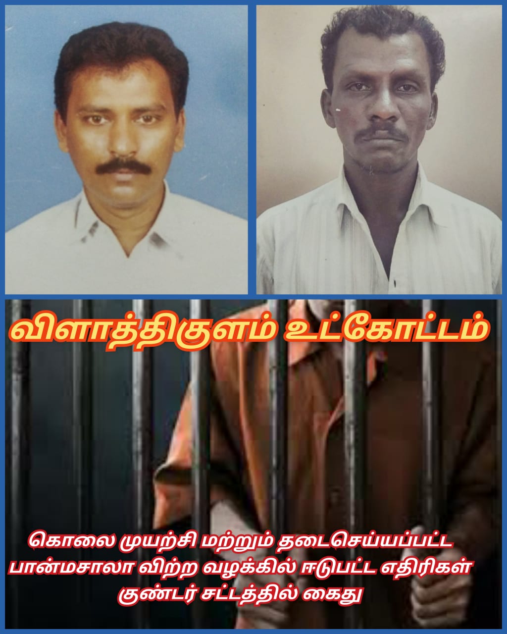 ???? *அதன் பேரில் மாவட்ட ஆட்சியர் டாக்டர் திரு. கே. செந்தில் ராஜ் இ.ஆ.ப அவர்கள் விளாத்திகுளம் சன்னதி தெருவைச் சேர்ந்த கனிராஜ் மகன் 1) ஜெயராஜ் மற்றும் விளாத்திகுளம் குரலையம்பட்டியைச் சேர்ந்த உமையனன் என்பவரது மகன் 2) கணேசமூர்த்தி ஆகிய 3 பேரை குண்டர் தடுப்புச் சட்டத்தில் கைது செய்ய உத்தரவிட்டார். அவரது உத்தரவின் பேரில் சம்மந்தப்பட்ட காவல் ஆய்வாளர் மேற்படி எதிரிகள் 2பேரையும் குண்டர் தடுப்புச் சட்டத்தில் கைது செய்து பாளையங்கோட்டை மத்திய சிறையில் அடைத்தனர். மேலும் இதுவரை விளாத்திகுளம் உட்கோட்டத்தில் மட்டும் கடந்த 9 மாதங்களில் 11பேர் குண்டர் தடுப்பு சட்டத்தில் கைது செய்யப்பட்டு சிறையில் அடைக்கப்பட்டுள்ளனர்.*