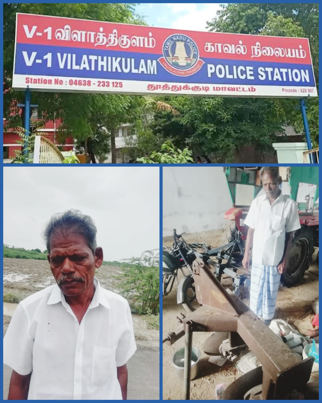 விளாத்திகுளம் காவல் நிலைய எல்லைக்குட்பட்ட அயன் பொம்மையாபுரம் பகுதியை சேர்ந்த வித்ய சேரபாண்டியன் மகன் அகிலன் (51) என்பவர் தனக்கு சொந்தமான விவசாய நிலத்தில் டிராக்டர் வைத்து உழவு செய்து வருகிறார். இந்நிலையில் கடந்த 24.08.2021 அன்று இரவு உழவு வேலை முடித்துவிட்டு அதே பகுதியில் உள்ள தனது குடோனுக்கு அருகில் நிறுத்தி வைத்து விட்டு சென்றுள்ளார். மறுநாள் (25.08.2021) காலை அகிலன் சென்று பார்க்கும்போது டிராக்டரில் இருந்த ரூபாய். 20,000/- மதிப்புள்ள சட்டி கலப்பையை காணவில்லை எனத் தெரியவந்ததும் அக்கம்பக்கத்தில் தேடியுள்ளார். சட்டிக் கலப்பை கிடைக்காமல் போக நேற்று (02.10.2021) அகிலன் அளித்த புகாரின் பெயரில் விளாத்திகுளம் காவல் நிலைய போலீசார் வழக்குப்பதிவு செய்து விசாரணை மேற்கொண்டு வந்தனர்.