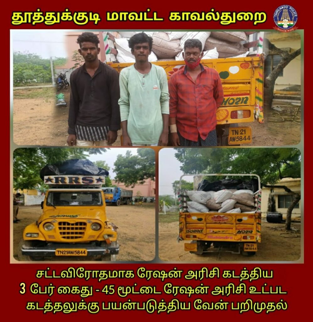 விளாத்திகுளம் உட்கோட்டத்தில் புதூர் காவல் நிலைய எல்லைக்கு உட்பட்ட சிவலார்பட்டி பகுதியில் ரேஷன் அரிசி கடத்திய 3 பேர் கைது – 45 மூட்டைகளில் 2250 கிலோ ரேஷன் அரிசி மற்றும் கடத்தலுக்கு பயன்படுத்திய வேன் பறிமுதல்.