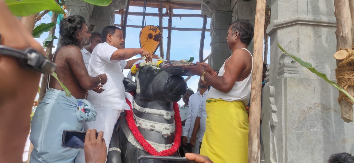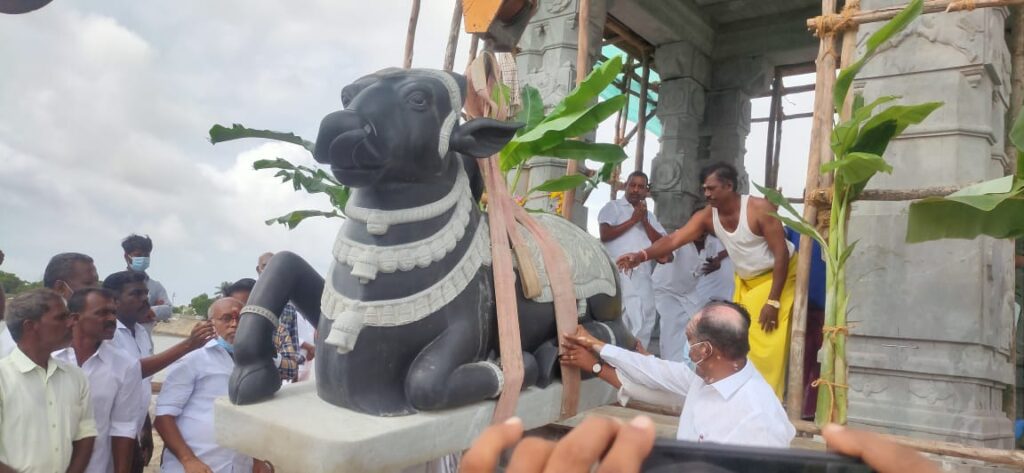 நந்தீஸ்வரர் ஆலயத்தை முன்னாள் அமைச்சரும் வேதாரணியம் சட்டப்பேரவை உறுப்பினருமான ஓ. எஸ். மணியன் தன்னுடைய சொந்த நிதியின் கீழ் கட்டி வருகிறார். அதில் வைக்கப்படும் நந்தீஸ்வரரை நிர்மானிக்கும் பணி இன்று நடைபெற்றது. ஒரே கல்லால் ஆன நந்தீஸ்வரர் கிரேன் மூலம் மண்டபத்தின் நடுவே பூஜைகளுக்குப் பின் நிர்மானிக்கப்பட்டது.