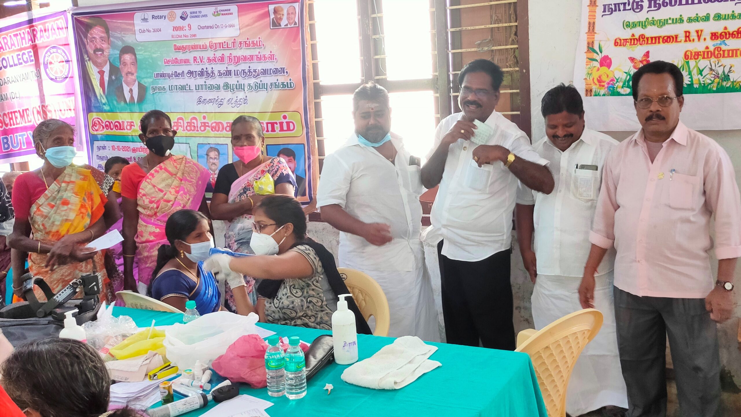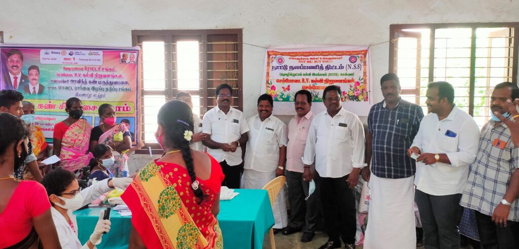வேதாரண்யம் அடுத்த செம்போடை ஆர்.வி கல்வி நிறுவன வளாகத்தில் வேதாரண்யம் ரோட்டரி சங்கம், செம்போடை ஆர்.வி கல்வி நிறுவனங்கள், பாண்டிசேரி அரவிந்த் கண் மருத்துவமனை மற்றும் நாகை மாவட்ட பார்வை இழப்பு தடுப்பு சங்கம் இணைந்து மாபெரும் இலவச கண் சிகிச்சை முகாம் நடந்தது.